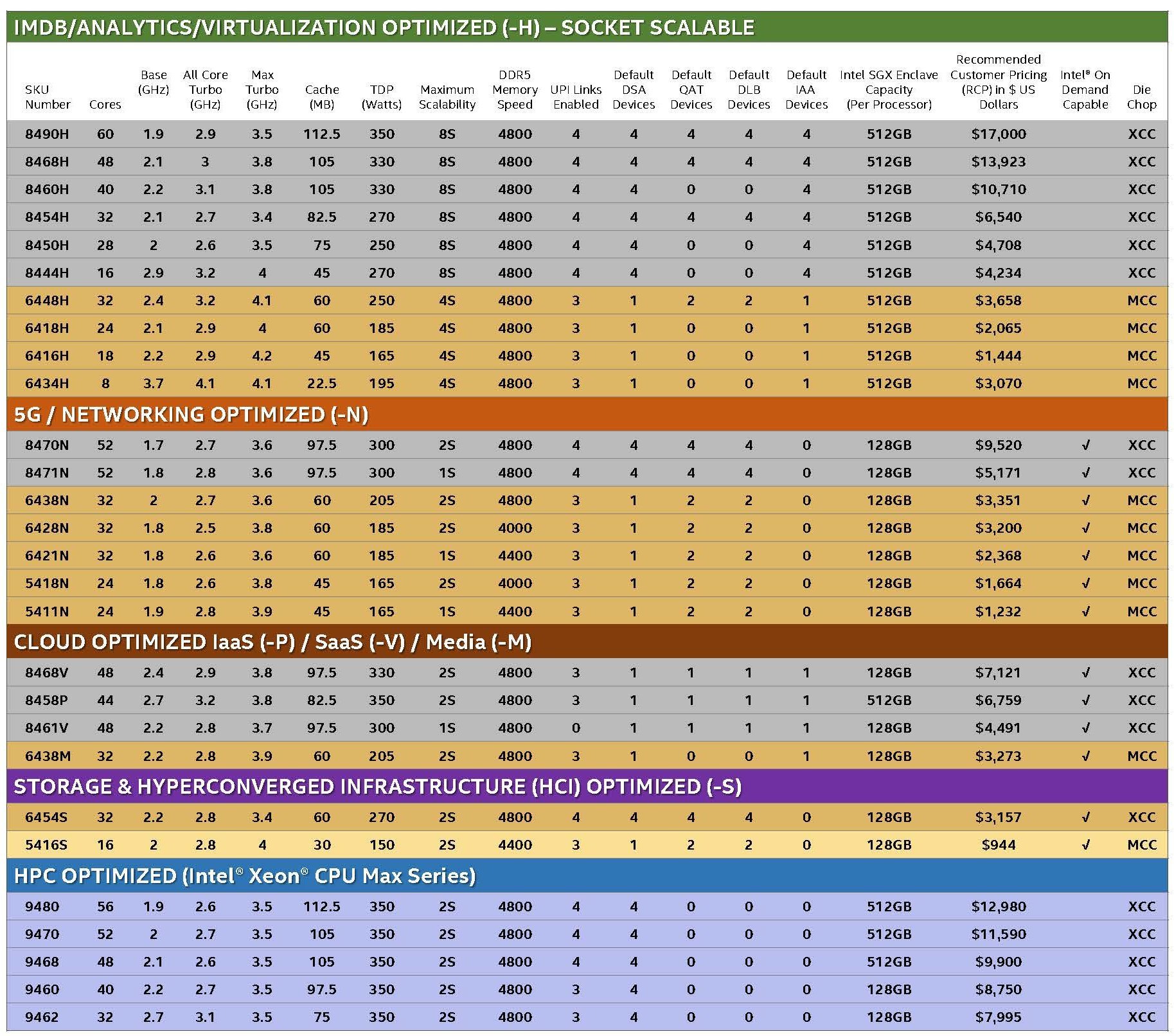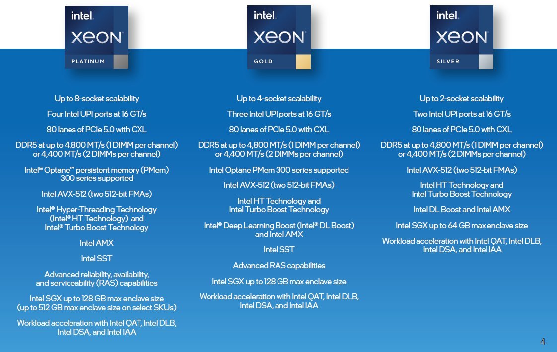Nové procesory mají i společné vlastnosti jako, jako jsou podpora osmikanálových pamětí DDR5 (16 × DIMM na socket, 4 800 MHz), rozhraní PCI Express 5.0, CXL (Compute Express Link) 1.1 či až 50% nárůst počtu jader na socket. Důležitou inovací je také nasazení specializovaných výpočetních akcelerátorů, o kterých budeme hovořit později.