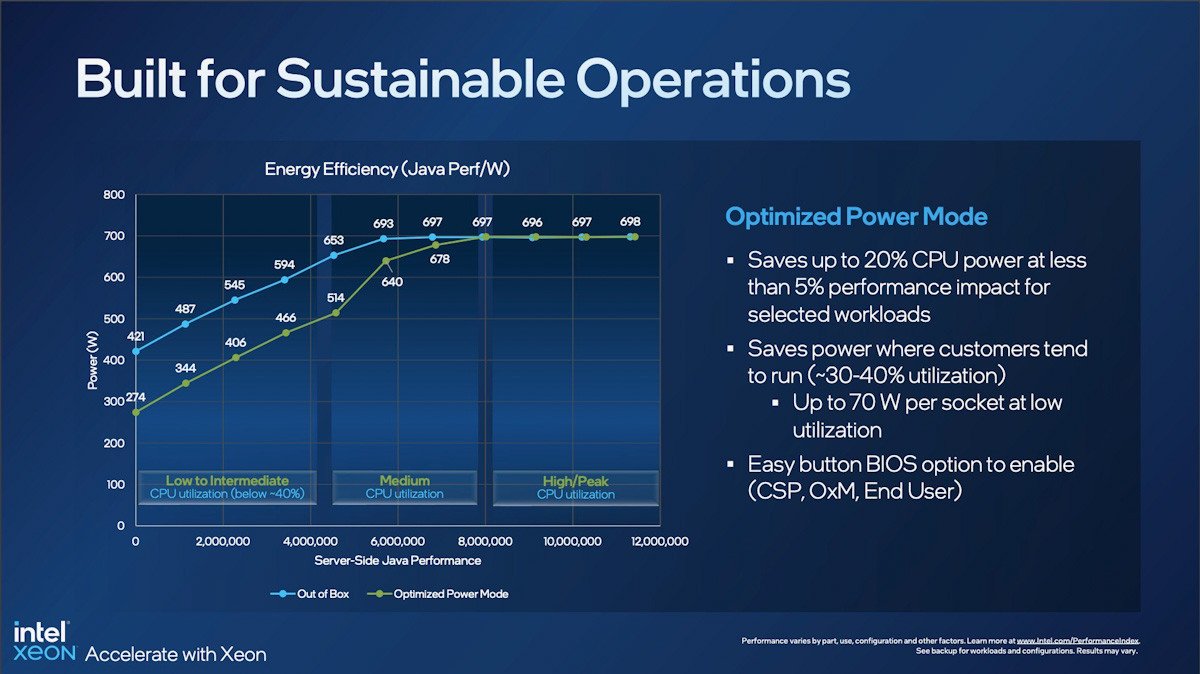 Jedním z provozních aspektů, na které se v Intelu intenzivně zaměřili, je energetická efektivita. Výrobce uvádí, že ve zkušební sadě nejběžnějších reálných pracovních zátěží naměřil až 2,9× zlepšení efektivity poměru „výkon na watt.“ Další úspory slibuje nový režim „Optimized Power Mode“ schopný u specifických typů zátěže přinést až 20% snížení spotřeby energie na socket při méně než pětiprocentním dopadu na výkon. Určitou redukci spotřeby mohou doručit také změny v oblasti chlazení (vzduchového i kapalinového).