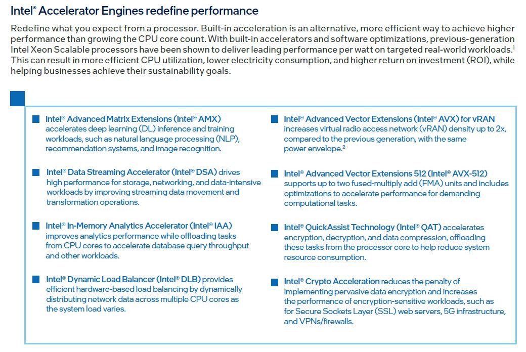Situace s akcelerátory u jednotlivých modelů však není vůbec jednoduchá. Vedle některých méně významných akcelerátorů (nebo těch, které již známe z dřívějších procesorů, jako AVX-512), jsou zde čtyři hlavní: