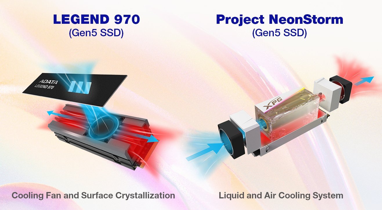 Adata u svého projektu NeonStorm využívá pro chlazení SSD formátu M.2 speciální metodu rozptylu tepla kombinující chladicí kapalinu a dva ventilátory. Vznikající teplo prochází nejprve kovovým rozptylovačem tepla, aby se zvětšila kontaktní plocha. Po odvedení do kapalinového zásobníku je tepelná energie pohlcena chladicí kapalinou a poté přechází do chladiče z hliníkové slitiny. Chladič funguje jako médium mezi chladicí kapalinou a ventilátory. Po aktivaci ventilátorů na obou koncích chladiče SSD disku je teplo odváděno konvekcí horkého a studeného vzduchu. Ve srovnání s ventilátorovými žebry bez kapalinového chlazení dokáže tento systém snížit teploty o 20 %. Nová technologie byla nasazena např. u modelu Legend 970 Gen5 s kapacitou až 8 TB a rychlostmi až 14 000 MB/s při čtení dat a až 12 000 MB/s při jejich zápisu.
