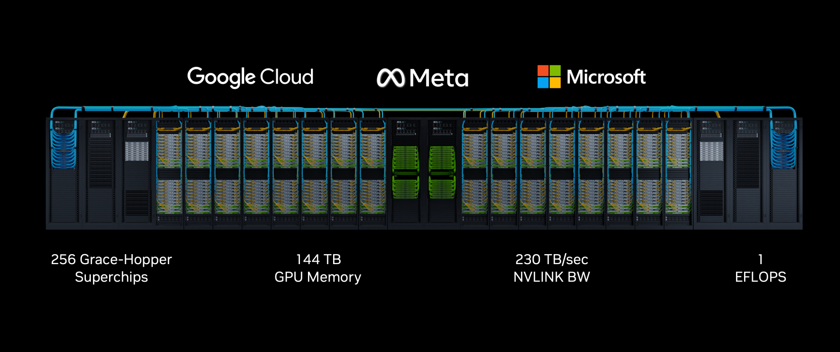 Jednou ze zásadních novinek je informace o zahájení výroby „superčipu“ GH200 (je známý také jako „Grace Hopper“), který do jednoho balíčku spojuje jádra Nvidia „Grace“ na bázi ARMu spolu s tensor jádry Nvidia H100 „Hopper“ (tedy s architekturou využívanou u běžných grafik). Tento extra výkonný čip má za úkol urychlovat náročné výpočty a obsahuje 72 ARM jader, 96 GB paměti HBM3 a 576 GB grafické paměti.