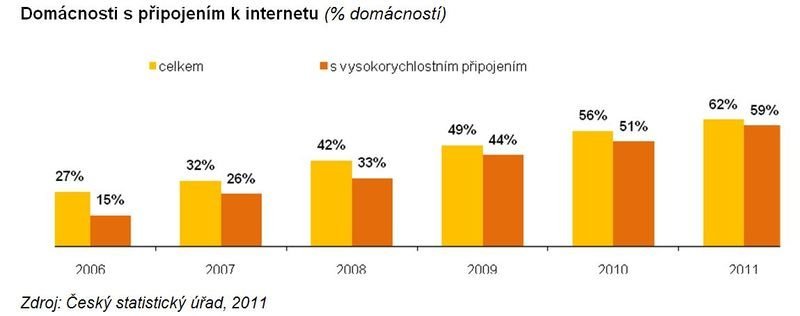 Za posledních pět let se také výrazně změnil způsob připojení českých domácností k internetu. Do roku 2006 převládalo v českých domácnostech nízkorychlostní připojení prostřednictvím vytáčené telefonní linky (35 procent z domácností), v současnosti nejsou tímto způsobem připojena ani čtyři procenta domácností s internetem. Nejčastějším způsobem internetového připojení českých domácností je na rozdíl od většiny ostatních zemí EU bezdrátové připojení (Wi-Fi) – letos tento způsob připojení využívala polovina (51 procent) domácností s internetem.