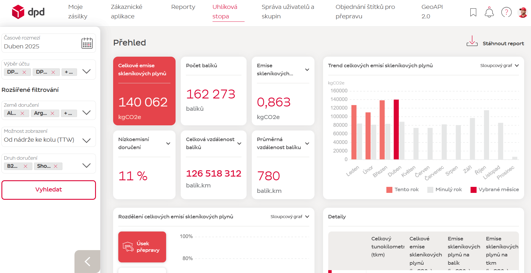 Prostřednictvím myDPD for business je také možné zásilky sledovat, přesměrovat na jiné místo, stahovat potvrzení o doručení nebo spravovat přehled objednávek. Odesílatelé navíc zdarma získají přesný přehled o uhlíkové stopě z akreditovaného nástroje určený pro jejich strategické rozhodování. Znají tak dopad své přepravy na životní prostředí včetně detailního výpočtu emisí skleníkových plynů.