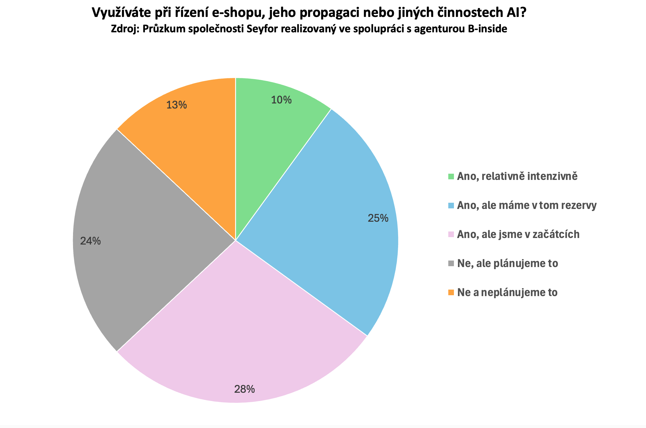 Umělá inteligence se v české a slovenské e-commerce prosazuje, její využívání je však zatím soustředěno především na jednodušší operativní úkony. Podle aktuálního průzkumu společnosti Seyfor využívá AI intenzivně pouze deset procent e-shopů, zatímco více než čtvrtina firem je teprve na úplném začátku a třináct procent s jejím nasazením vůbec nepočítá.