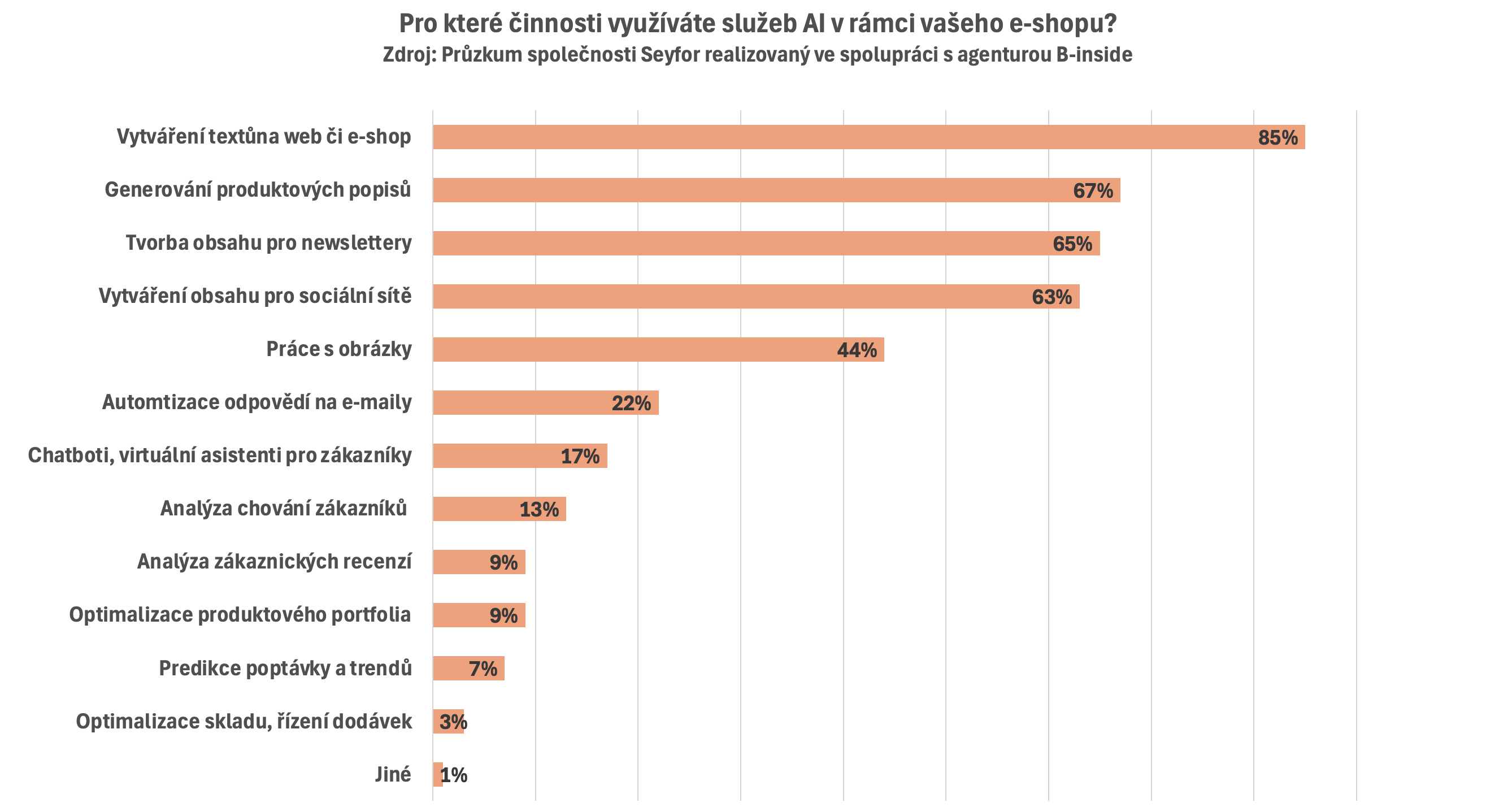 E-shopy, které AI již do svých procesů implementovaly, ji nejčastěji využívají pro generování obsahu. Tvorbu návrhů textů na web svěřuje umělé inteligenci 85 % oslovených e-commerce podnikatelů, 67 % ji nechává generovat produktové popisy a 65 % si ji bere na pomoc při přípravě newsletterů. Uplatnění nachází AI také v oblasti přípravy obsahu pro sociální sítě (63 %) a přípravy vizuálů, například při generování či vylepšování obrázků (44 %).