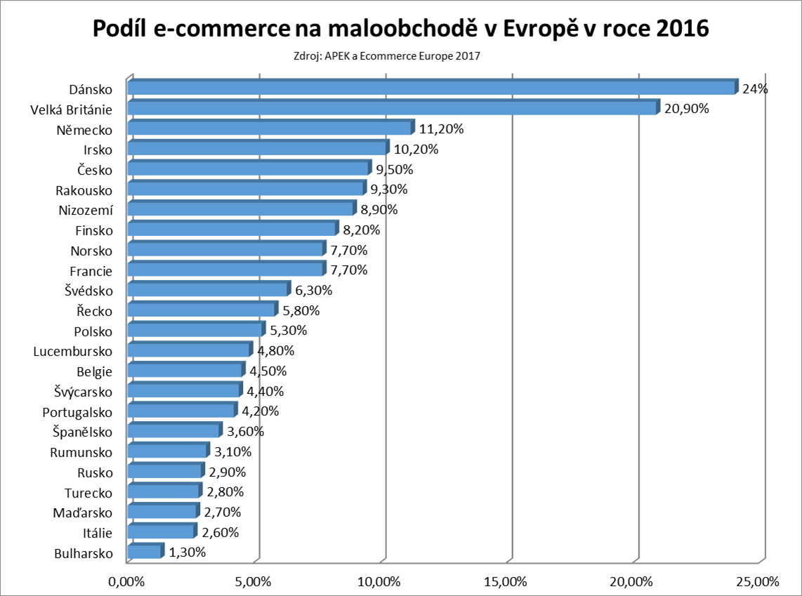 Prodej po internetu se v roce 2016 podílel na českém maloobchodě 9,5 %. I v porovnání s dalšími evropskými státy si česká e-commerce scéna vede více než dobře. Česká republika se podle údajů APEK řadí mezi pět zemí s nejvyšším podílem prodeje po internetu na maloobchodě v celé EU.