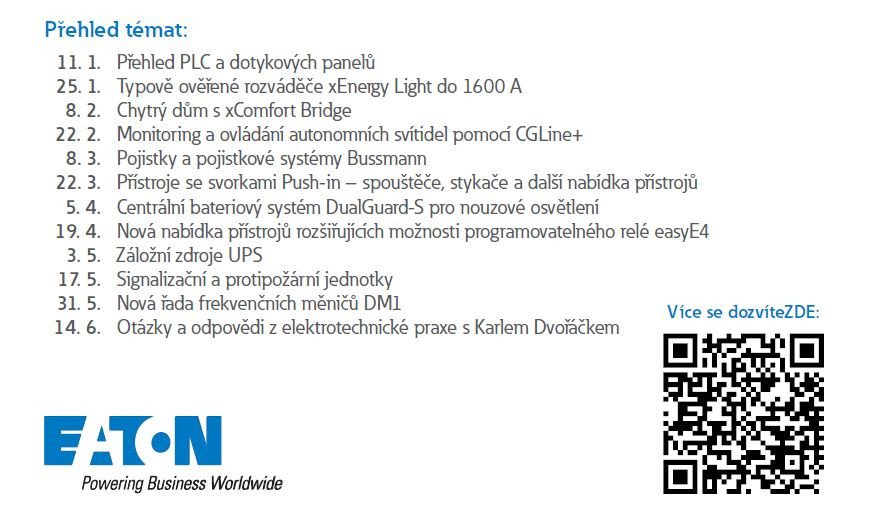 Červnová přednáška nezávislého odborníka Karla Dvořáčka, který je předsedou „Technické normalizační komise“ (TNK) č. 22 pro elektrotechniku, bude určitě jedním z nejočekávanějších bodů programu. Zaměří se na dotazy účastníků, které se týkající norem a dalších témat, kterými se zabývá v rámci svého působení v Česká komoře autorizovaných inženýrů a techniků. Další odborná témata, která povedou produktoví specialisté společnosti Eaton, budou zahrnovat přehled PLC a dotykových panelů, typově ověřené rozváděče xEnergy Light do 1600 A, monitoring a ovládání autonomních svítidel pomocí CG Line+, pojistky a pojistkové systémy Bussmann, přístroje se svorkami Push-in - spouštěče, stykače a další nabídka přístrojů, centrální bateriový systém DualGuard-S pro nouzové osvětlení, nová nabídka přístrojů rozšiřujících možnosti programovatelného relé easyE4, záložní zdroje UPS, signalizační a protipožární jednotky a nová řada frekvenčních měničů DM1.