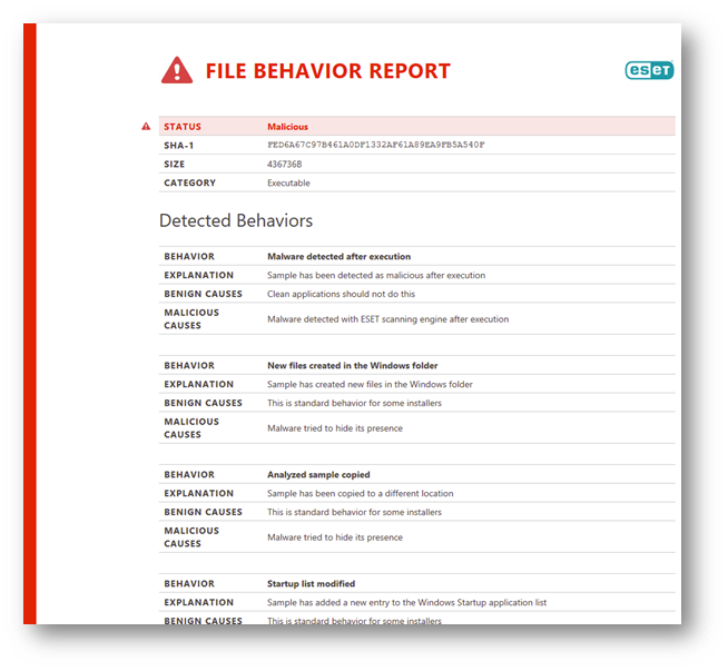Ukázka zprávy o chování podezřelého vzorku v ESET Dynamic Threat Defense