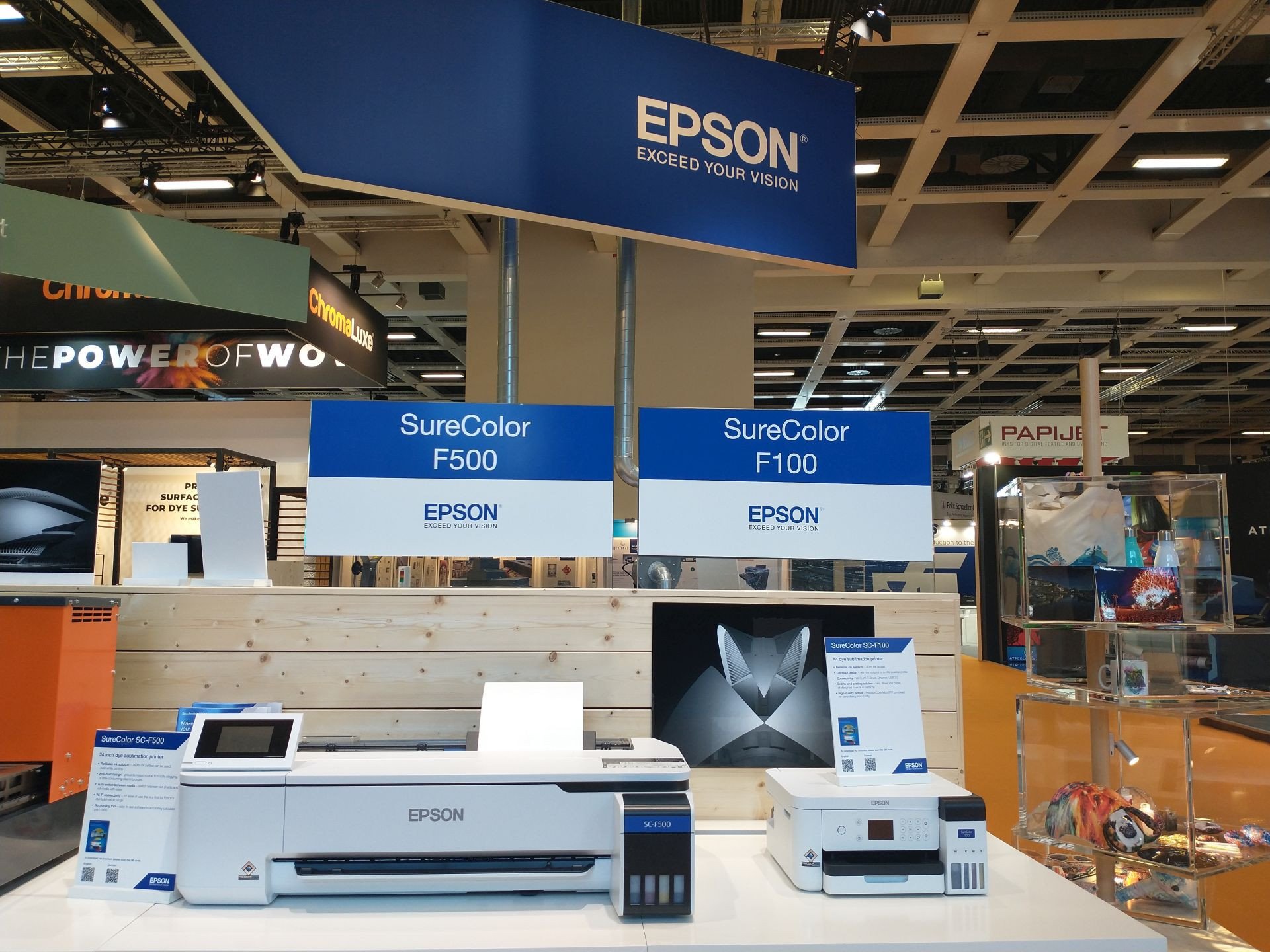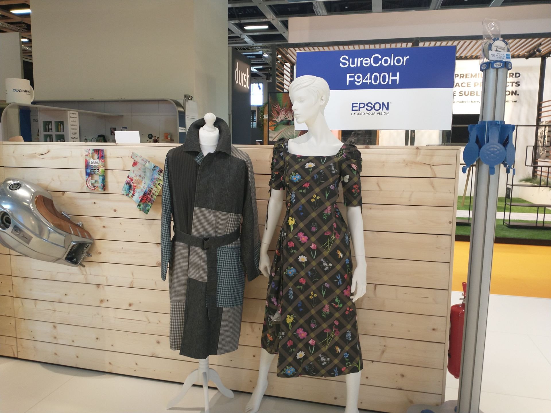 Sublimační tiskárny Epson SureColor SC-F9400H a SC-F10000H, pracující s fluorescenčními inkousty, ukazovaly různá využití včetně módy, sportovního oblečení, bytového textilu a měkkého značení. SureColor SC-F9400H s úhlopříčkou 64" má dvě fluorescenční inkoustová řešení (žluté a růžové), která dodávají intenzitu jasným a živým barvám. Šestibarvovou sublimační tiskárnu SC-F10000H s úhlopříčkou 76" a průmyslovým provedením lze nakonfigurovat tak, aby obsahovala originální fluorescenční (žlutý a růžový) nebo světlé inkousty (azurový nebo purpurový) a ještě více tak rozšířila nabídku produktů.