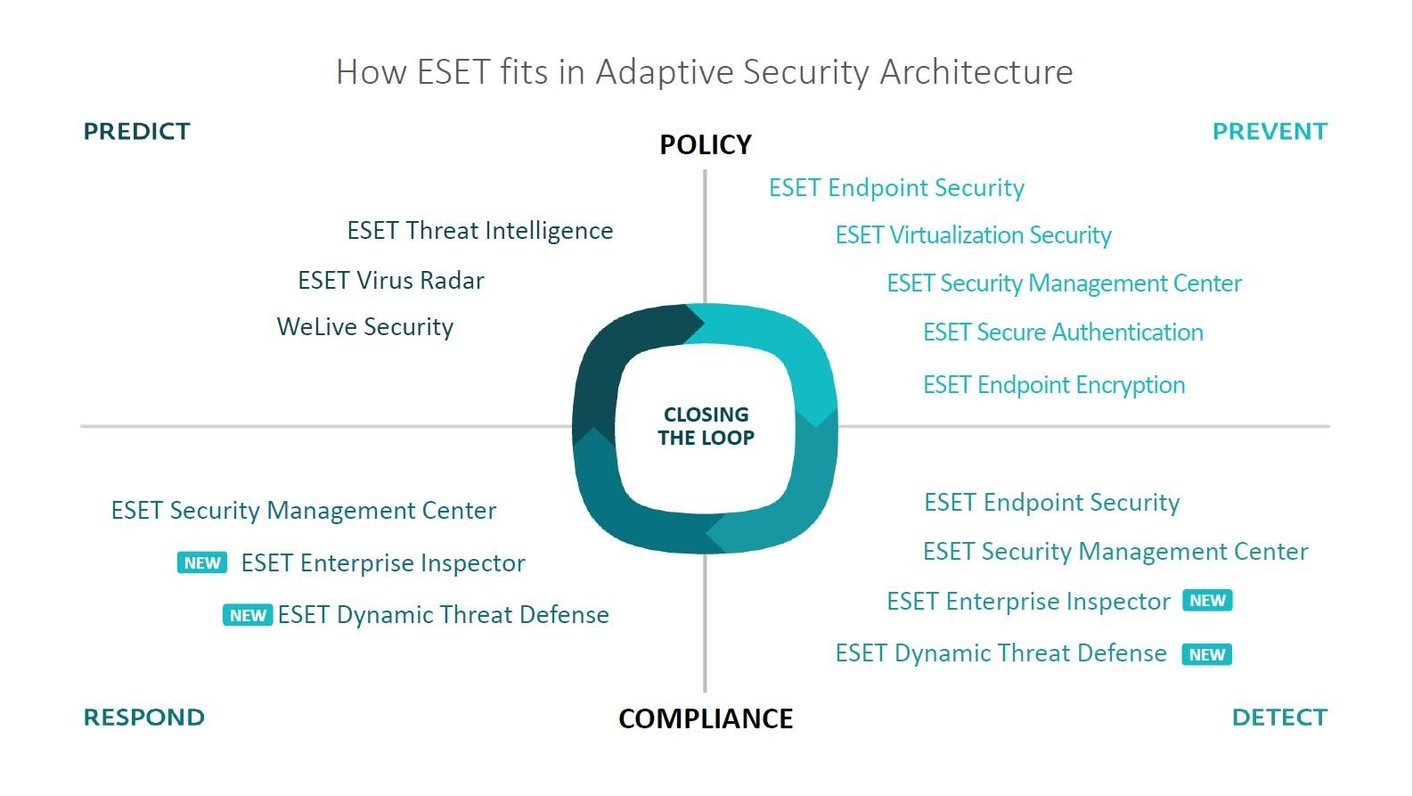 ESET ve svých nových produktech a službách představuje řadu nástrojů v oblasti kybernetické ochrany kombinovanou se zabezpečením koncových zařízení. Naprostou novinkou je ESET Enterprise Inspector (EEI), nástroj pro detekci a monitoring chování koncových zařízení (EDR), jehož prostřednictvím lze odhalit nezvyklé chování a události na sledovaných zařízeních. Dokáže odhalit sofistikované cílené útoky, automaticky upozorňuje na anomálie v síti, okamžitě reaguje na hrozby, zajišťuje přehled nad děním ve firemní síti a zprostředkovává prošetření vzniklých incidentů. Prostřednictvím platformy ESET Endpoint Security získává data v reálném čase. Toto řešení je zcela přizpůsobitelné nárokům a požadavkům klientů a poskytuje mnohem podrobnější monitoring, který zajistí lepší prevenci a reakci proti všem typům kybernetických útoků, bez ohledu na jejich intenzitu.