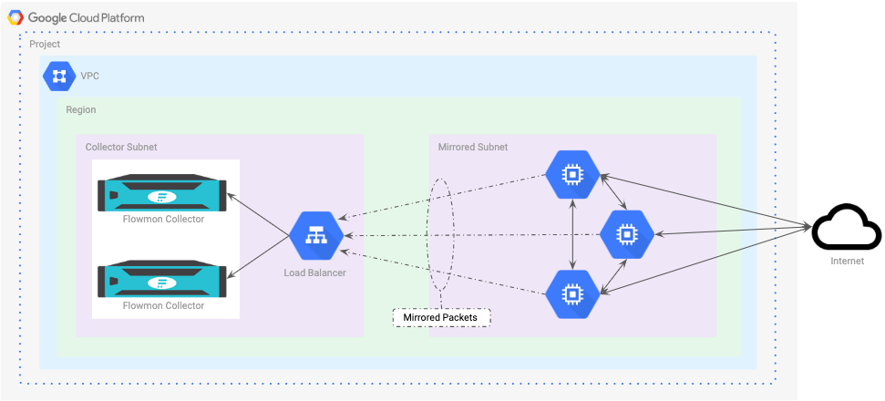 Packet Mirroring je virtuální ekvivalent síťového TAPu. Doručuje kopii datového provozu monitorovacím a bezpečnostním zařízením k následné analýze. Zrcadlená data jsou odesílána do interního Load Balanceru a odtud do jednoho nebo více Flowmon kolektorů s integrovanou Flowmon sondou. To umožňuje Flowmonu nabídnout plnou funkčnost se stejnou úrovní viditelnosti jako v on-premise prostředí.