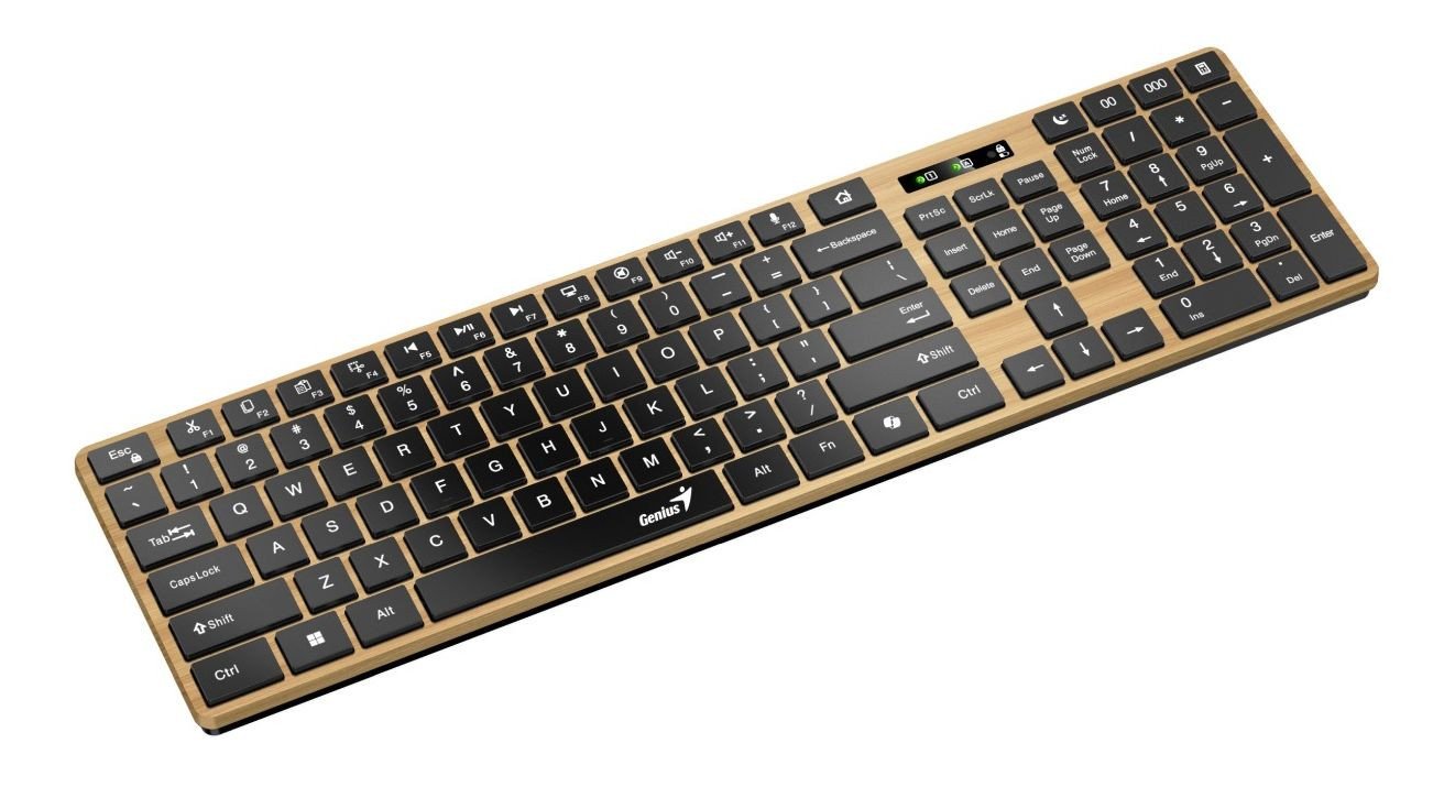 Genius SlimStar 7250BT je bezdrátová klávesnice se dvěma režimy připojení (Bluetooth + 2,4 GHz), která kombinuje elegantní vzhled borového dřeva s rozšířenými funkcemi pro úpravu dokumentů a ovládání multimédií. Klávesnice typu chiclet s tichou odezvou kláves zajistí pohodlnou a efektivní práci.