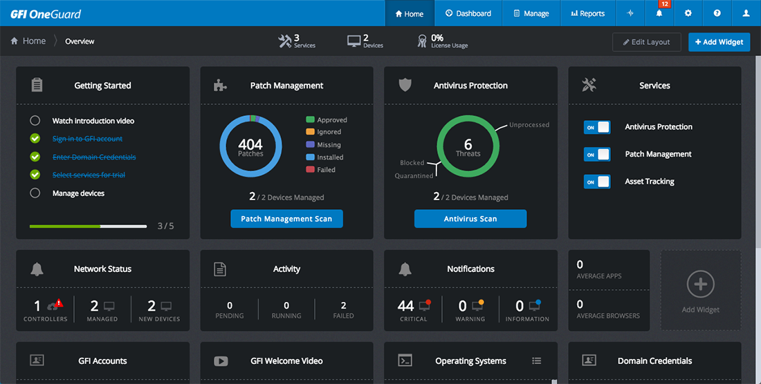 GFI OneGuard automatizuje úkoly, jako je audit sítě, záplatování, aktualizace, reportování a vyhledávání virů z jedné konzole. V současné době nabízí následující služby: