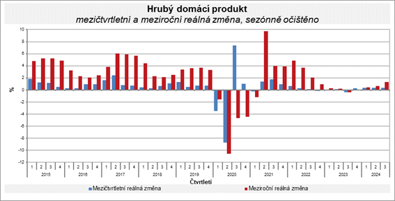 Podle předběžného odhadu ČSÚ vzrostl hrubý domácí produkt ve 3. čtvrtletí mezičtvrtletně o 0,3 % a meziročně o 1,3 %.