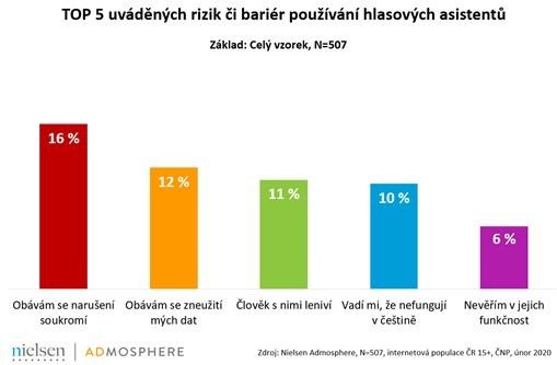 Najde se také řada respondentů (bez ohledu na to, zda hlasové asistenty sami používají nebo ne), kteří vnímají určitá rizika či bariéry spojené s jejich používáním. Ve výzkumu o nich hovoří více než polovina dotázaných. Nejčastěji zmiňovaná je obava z narušení soukromí (16 %). Do jisté míry se lidé obávají i zneužití svých dat (12 %); některým se nelíbí, že s hlasovými asistenty člověk leniví (11 %) a někomu zase vadí, že hlasoví asistenti nefungují v češtině (10 %).