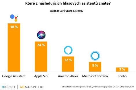 Z věkových skupin se s funkcí hlasových asistentů v největší míře setkali respondenti ve věku 15–34 let (71 %). Z dotázaných mezi 35 a 44 lety je to pak 57 % a ve věku nad 45 let už pouze 32 %. S přehledem nejznámější službou tohoto typu je Google Assistant, kterého zná 38 % dotázaných. Na druhém místě je Siri od společnosti Apple (tu zná 24 %) a na třetím Alexa od Amazonu (12 %).