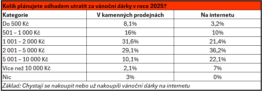 Jak tedy Češi plánují rozložit svojí chystanou útratu? „Z výzkumu nám vyplynulo, že v e-shopech očekávají spotřebitelé větší výdaje než v kamenných prodejnách. Zatímco v tradičních obchodech na otázku, kolik se připravují utratit za vánoční dárky, je nejčastější rozmezí jeden až dva tisíce korun, v e-shopech je to dva až pět tisíc,“ řekl Jan Vetyška.