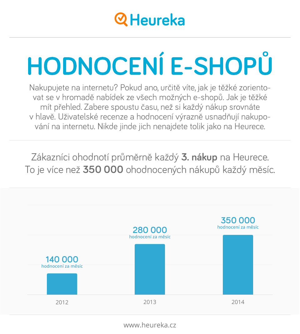 Hodnocení a recenze téměř čehokoliv jsou ve světě internetu dlouhodobým fenoménem, u internetových obchodů to platí dvojnásob. Pro zákazníka jsou v současnosti recenze a hodnocení jednou z nejdůležitějších věcí, podle které se rozhodují o nákupu. Češi se naučili recenze nejen číst, ale sami aktivně e-shopy a spokojenost s nimi hodnotí. „Průměrný měsíční počet hodnocení nákupů vzrostl meziročně zhruba o čtvrtinu, od roku 2012 se tento počet udělených recenzí nebo hodnocení nákupů téměř ztrojnásobil,“ řekl Tomáš Braverman, ředitel nákupního rádce Heureka.cz, a pokračoval: „Na Heurece je zákazníky hodnocen téměř každý třetí nákup, tento rok udělili zákazníci průměrně 350 000 hodnocení nebo recenzí měsíčně.“