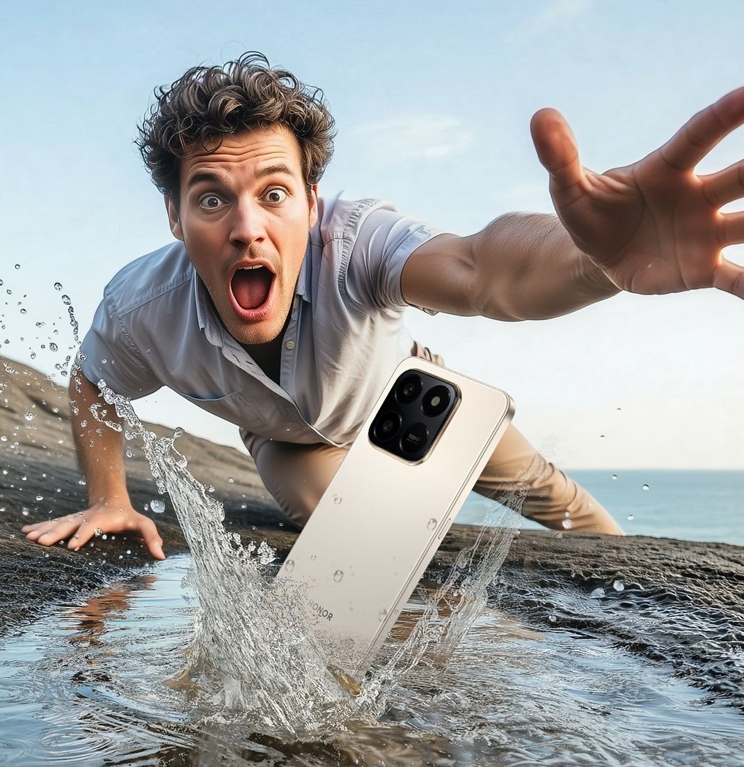 Díky odolnosti IP54 telefonu HONOR X7d neuškodí namočení, opláchnutí ani postříkání vodou. Telefon byl testován při ponoření do vody po dobu až jedné minuty v hloubce 0,5 metru. Díky vylepšenému zpracování lze navíc telefon pohodlně ovládat i mokrými nebo mastnými prsty.