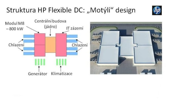 Řešení HP Flexible DC je postaveno na „motýlím" návrhu tvořeném čtyřmi prefabrikovanými kvadranty či moduly, které jsou připojeny k centrální řídící sekci (tvarem tak připomíná motýla). K finanční efektivitě řešení přispívá zejména využití průmyslových komponent a optimalizovaný proces budování s řadou možností distribuce energie a chlazení.