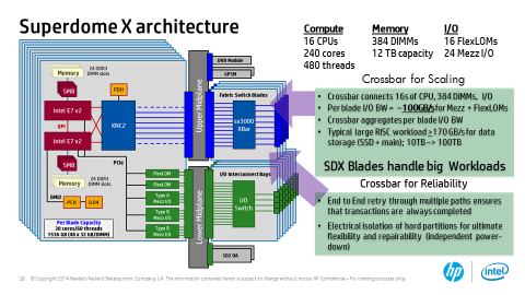Díky použití technologií z HP Integrity Superdome 2 je řešení vysoce škálovatelné. Nasazení chipové sady HP sx3000 a XNC2 přináší oproti standardnímu propojení CPU pomocí QPI téměř lineární nárůst výkonu, a to i v osmi- či šestnáctisocketové konfiguraci. Výhodou není pouze hrubý výpočetní výkon, který zajišťuje velké množství výkonných CPU, ale také velikost operační paměti, kterou je možné tento konvergovaný systém osadit. V maximální konfiguraci je to v současné chvíli 12 TB RAM. To je výhodné nejen pro virtualizaci, ale také pro „in memory computing“. Příkladem je aplikační a databázová platforma SAP HANA. HP nabízí Superdome X jako základní stavební kámen v konvergovaném řešení HP ConvergedSystem 900 for SAP HANA. To je dostupné v několika konfiguracích a kromě serverů obsahuje i diskový subsystém 3PAR StoreServ, předinstalovaný operační systém SLES, clusterový software HP ServiceGuard a další komponenty a součásti tohoto Scale-out řešení.