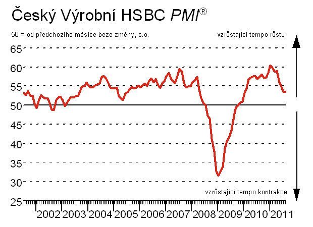Hlavní Výrobní PMI pro Českou republiku od HSBC je kompozitní jednociferný ukazatel celkového výkonu ve výrobním sektoru. Hodnoty nad 50 bodů poukazují na všeobecné zlepšení podnikatelských podmínek. PMI se oproti červencovému minimu ve výši 53,4 bodu nezměnil, což však maskuje rychlejší nárůst jak nových zakázek, tak výroby. Příspěvek těchto dvou složek však byl vymazán slabším výkonem v oblasti dodacích lhůt dodavatelů, zaměstnanosti a zásob vstupů na skladě.