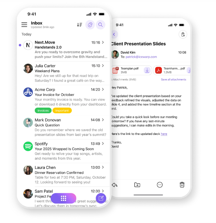 Mobilní e-mail přináší všechny výhody e-mailového klienta z desktopové verze do mobilní aplikace IceWarp. Díky tomu můžou uživatelé pokračovat v práci i ve chvíli, kdy nemůžou používat počítač nebo notebook. Mobilní aplikace, aktuálně pro operační systém iOS, plně integruje doručenou poštu s TeamChatem, Poznámkami a Dokumenty, a kopíruje tak hlavní funkce desktopové verze IceWarp Epos Update 3. Dosud aplikace nabízela pouze TeamChat, videokonference, práci s dokumenty a poznámkami.