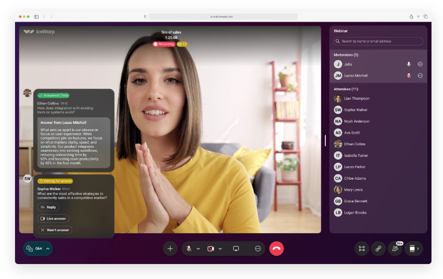Nový režim webináře umožňuje zapojit široké publikum do živého vysílání tak jako nikdy předtím. Uživatelé můžou během online akce pokládat živě otázky a získávat odpovědi, v prostředí lze spustit anketu pro účastníky a celou akci je možné automaticky nahrávat pro pozdější sdílení se všemi účastníky. Samotní účastníci se ale navzájem nevidí a ani nemůžou dohledat, kdo další se webináře zúčastnil a získat na něj kontakt. Webinářů se můžou účastnit i uživatelé bez přístupu do komunikační platformy IceWarp, stačí jim zaslat pozvánku s aktivním linkem.