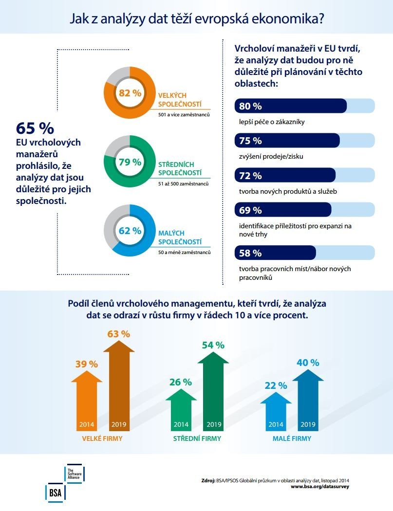 Dvě třetiny (65 %) vrcholových manažerů napříč Evropskou unií tvrdí, že analýza dat je důležitá pro další růst a plánování obchodní strategie. Nejvíce firem využívá datové analýzy pro zlepšení péče o zákazníky (80 %), podporu růstu prodeje (75 %), vývoj produktů a služeb (72 %), vstup na nové trhy (69 %) či pro nábor zaměstnanců (58 %).