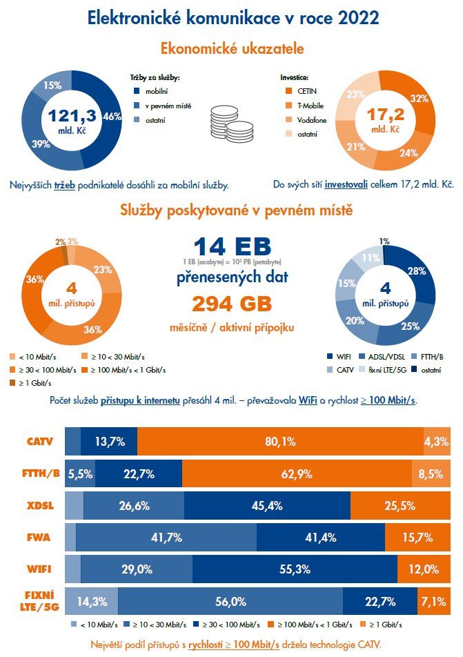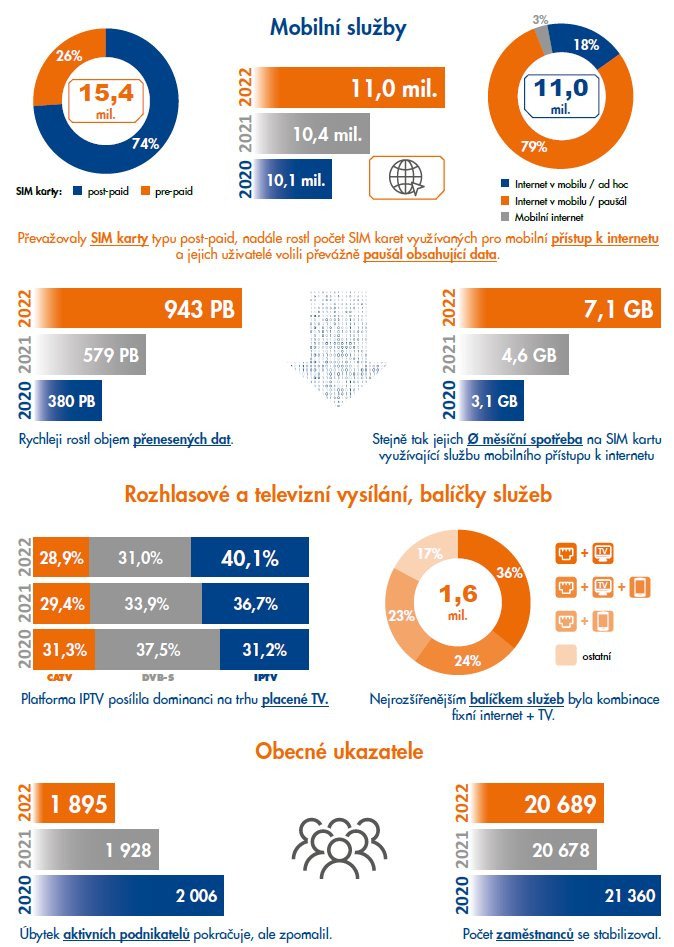 Mobilní datové služby byly na konci roku 2022 využívány poprvé na více než 11 milionech SIM kartách. Roste především obliba tarifního internetu na chytrých telefonech, za tři roky se počet karet s aktivovanou tarifní datovou službou zvýšil o 18 % na 8,8 milionu. Počet superrychlých fixních internetových přípojek (100 Mbit /s a více) vzrostl meziročně o pětinu.