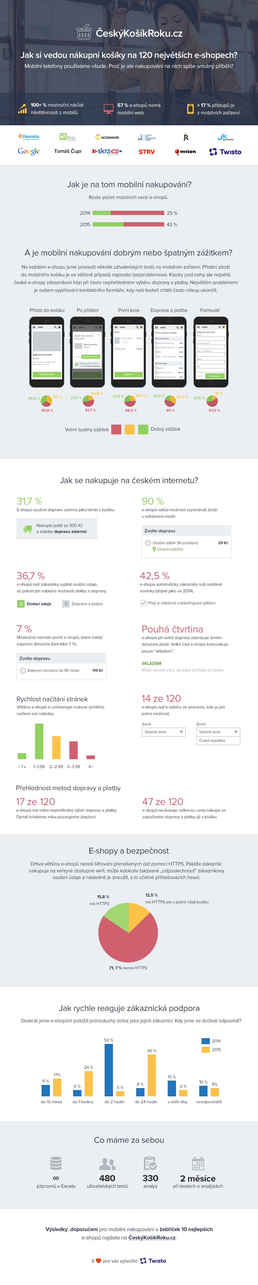 „V loňském roce měla pouhá čtvrtina e-shopů mobilní verzi webových stránek. Nynější studie ukázala, že mezi top 120 e-shopy má mobilní verzi 43 % obchodů, což je značný posun k budoucnosti, protože dle odborníků i celosvětového vývoje bude mobilní nakupování důležitou součástí celého e-commerce,“ vysvětlil Lukáš Hurych, organizátor studie a product director platební služby Twisto.cz. Studie kromě mobilního nakupování zkoumala také pohodlí a procesy nákupního procesu. Stejně jako v loňském roce, pouze sedm procent e-shopů nabízí expresní dodání zboží v den objednání. A pouhá čtvrtina e-shopů informuje v košíku o přesném datu doručení.