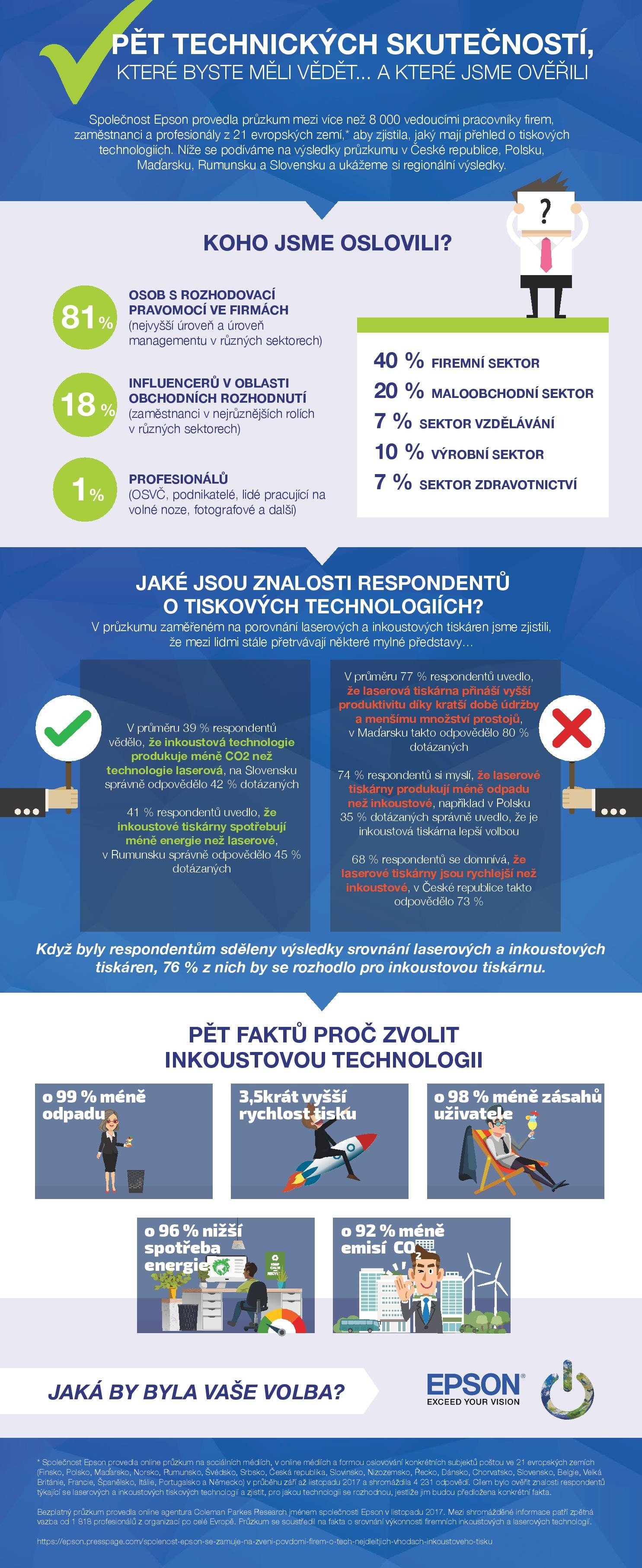 V průzkumu, který online provedly společnosti Epson Europe a Coleman Parkes, byly shromážděny názory více než 8 000 profesionálů z 21 evropských zemí včetně České republiky. Na základě nezávisle ověřených faktů týkajících se výkonnosti firemních inkoustových tiskáren ve srovnání s laserovými technologiemi bylo vytvořeno několik tvrzení. Tato tvrzení byla předložena respondentům s možností odpovědí pravda/nepravda za účelem ověření jejich znalostí. Výsledky byly překvapivé. Prokázaly, že stále přetrvává mnoho mylných představ ohledně toho, jaká technologie je výkonnější, zejména v souvislosti s odpadem a produktivitou. Pouze sedm procent respondentů vědělo, že inkoustová tiskárna podává vyšší výkon ve všech pěti testovaných oblastech: odpad, produktivita, rychlost, emise CO2 a spotřeba energie.