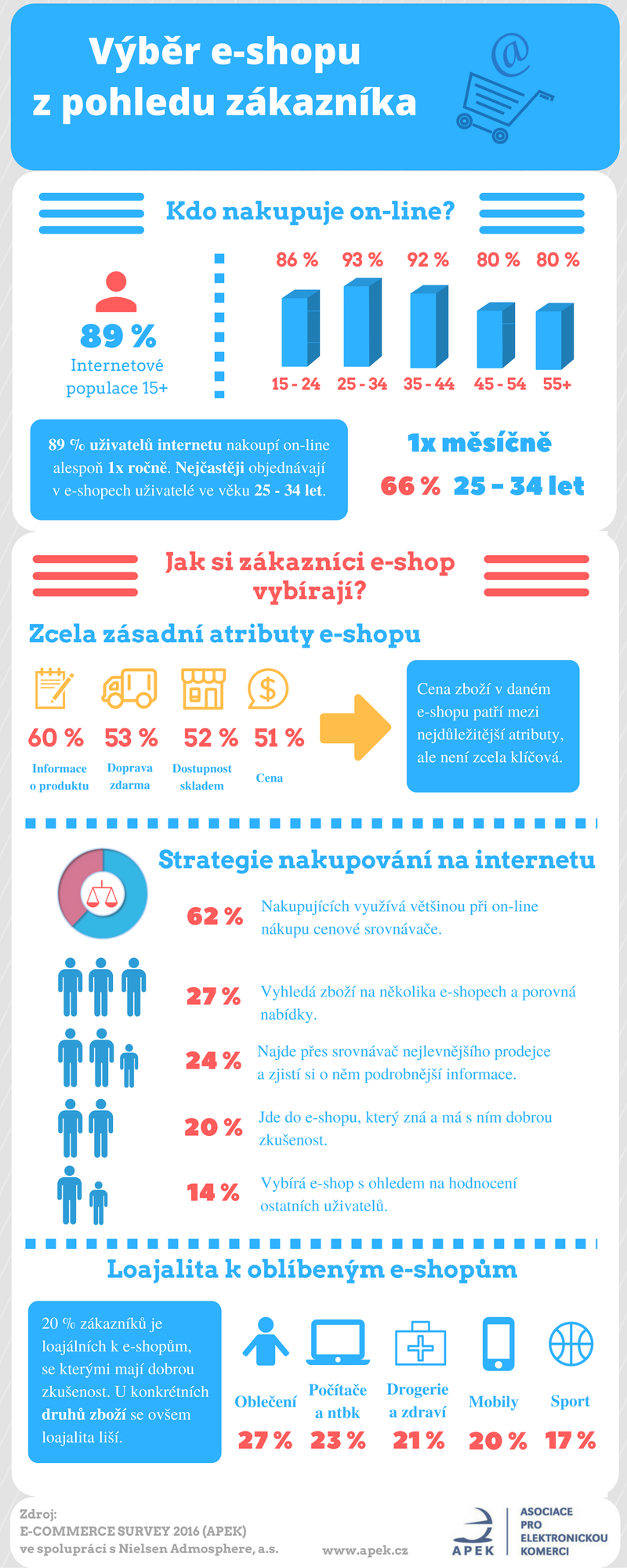 Zkušenost s nákupem on-line má podle nejnovějšího výzkumu APEK, kterého se zúčastnilo více než 1 500 respondentů, 89 % uživatelů internetu ve věku 15+. Není žádným překvapením, že nejčastěji objednávají zboží po síti zákazníci ve věku 25 až 34 let. Celkem 66 % respondentů v této věkové kategorii uvedlo, že na e-shopech nakoupí minimálně jednou za měsíc. „Naše nejnovější data potvrzují dlouhodobý trend. Na internetu se nakupuje pravidelně a opakovaně, e-komerce je již nedílnou součástí našeho každodenního života,“ uvedl výkonný ředitel APEK Jan Vetyška.
