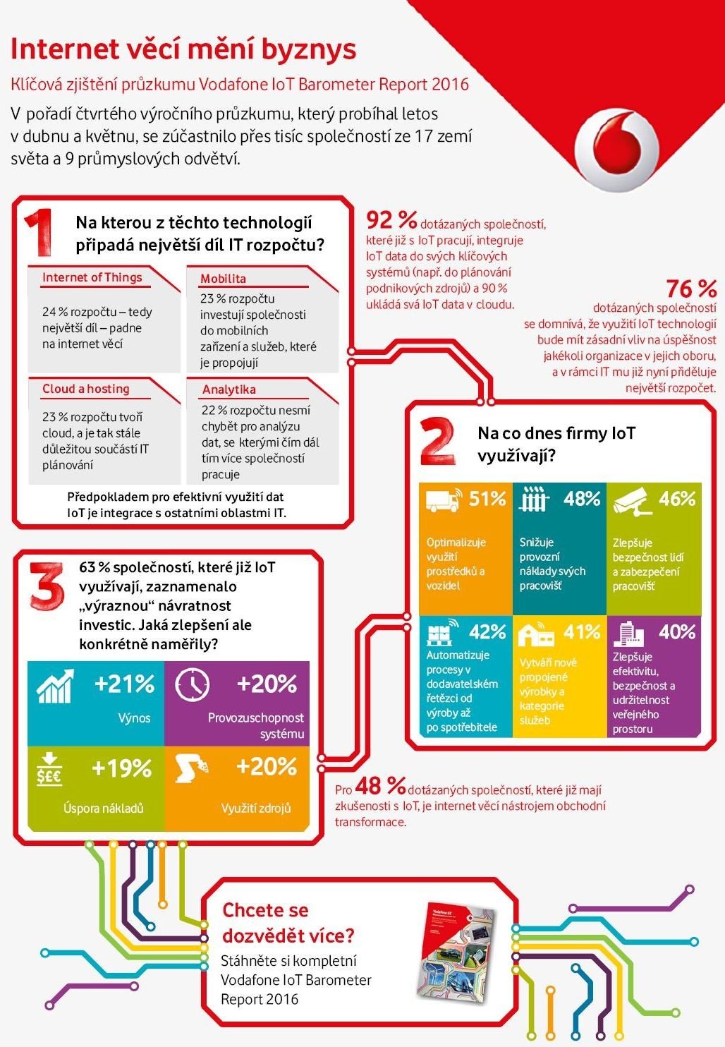 Podle průzkumu Vodafone IoT Barometer 2016 považují tři čtvrtiny dotázaných firem Internet věcí za klíč k budoucímu úspěchu. Investice do IoT dnes už představují 24 % průměrného IT rozpočtu a jsou srovnatelné s investicemi do cloudu nebo analýzy dat. Téměř polovina společností využívají IoT na podporu obchodní transformace. Stejná část plánuje vyvinout nové produkty a služby založené na IoT technologiích v následujících dvou letech.