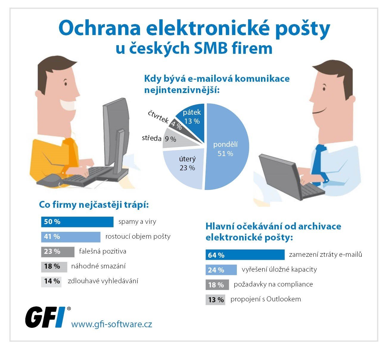- české SMB firmy v oblasti podnikové elektronické pošty nejčastěji trápí spamy a viry (50 %), rychle rostoucí objem pošty (41 %), falešná pozitiva (23 %), náhodné smazání (18 %) a zdlouhavé vyhledávání (14 %);