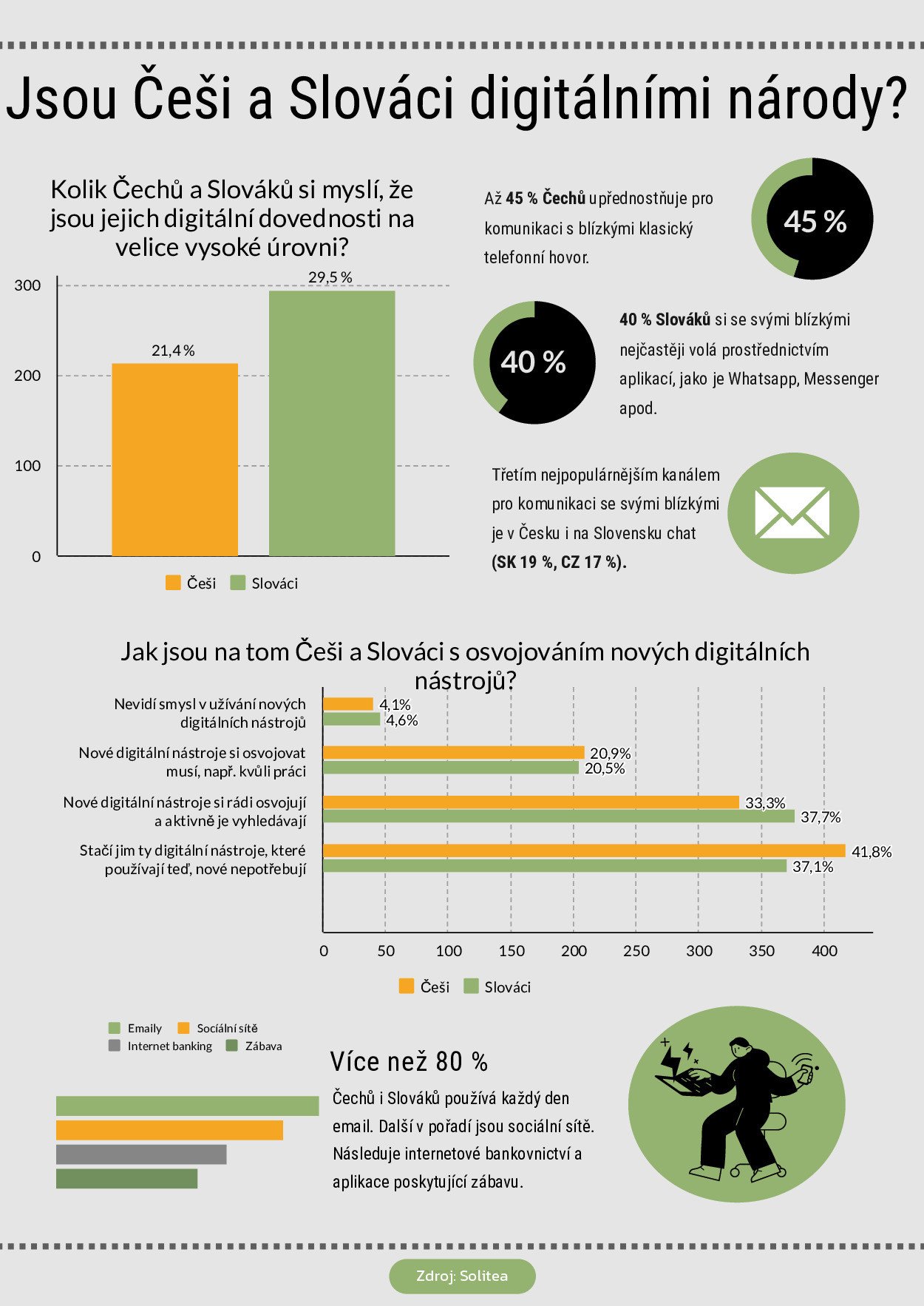 Polovina Čechů označuje své digitální dovednosti za nadprůměrné nebo dokonce velmi vysoké. Mezi Slováky je podíl takových lidí dokonce i o několik procent vyšší. Vysoké je také procento Čechů a Slováků, kteří si nové technologie a aplikace osvojují s radostí. Přesto se stále najdou oblasti, kde digitální řešení populární nejsou.