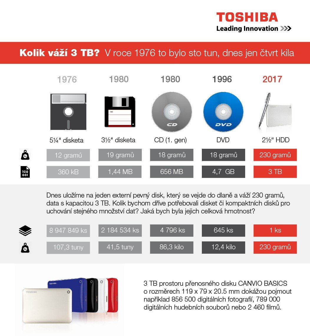Na jeden externí pevný disk, který se vejde do dlaně a váží kolem 250 gramů, dnes běžně uložíme několik terabytů dat. Disk s kapacitou 3 TB přitom jen pro ilustraci pojme přibližně 856 500 digitálních fotografií, 789 000 digitálních hudebních souborů nebo 2 460 filmů (v běžně používané kvalitě).