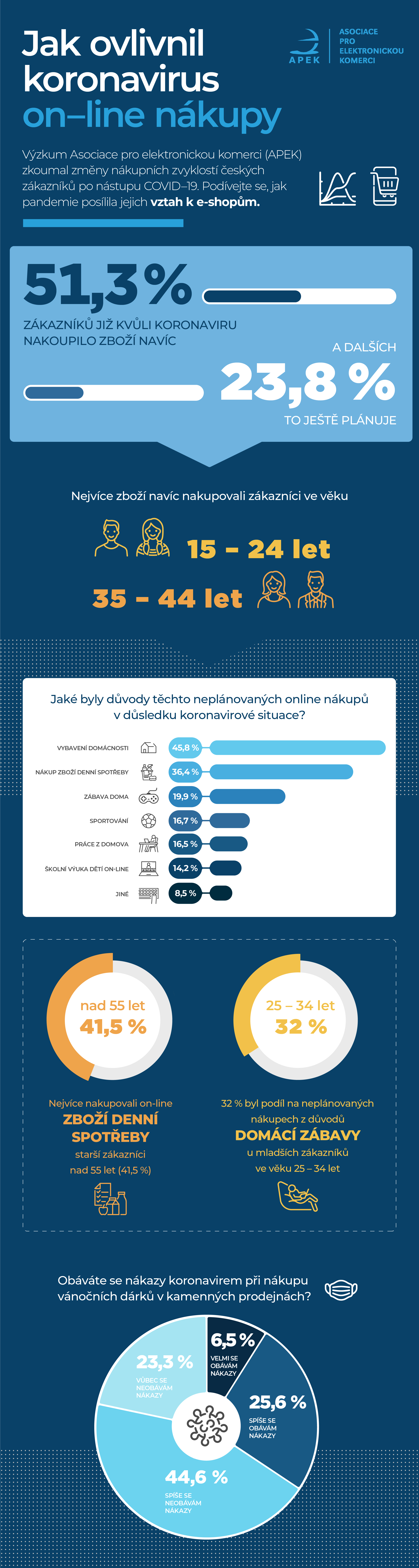 „V posledním čtvrtletí roku 2020 nás zajímalo, co znamenal COVID-19 a související opatření z pohledu spotřebitelů nakupujících na internetu. Proto jsme se jich zeptali, zda nakoupili nějaké zboží, které potřebovali s ohledem na nový životní styl, navíc. Více než polovina respondentů našeho výzkumu mezi uživateli internetu nám potvrdila, že v uplynulých třech měsících takovou objednávku v e-shopu provedla,“ uvedl výsledky výkonný ředitel APEK Jan Vetyška.