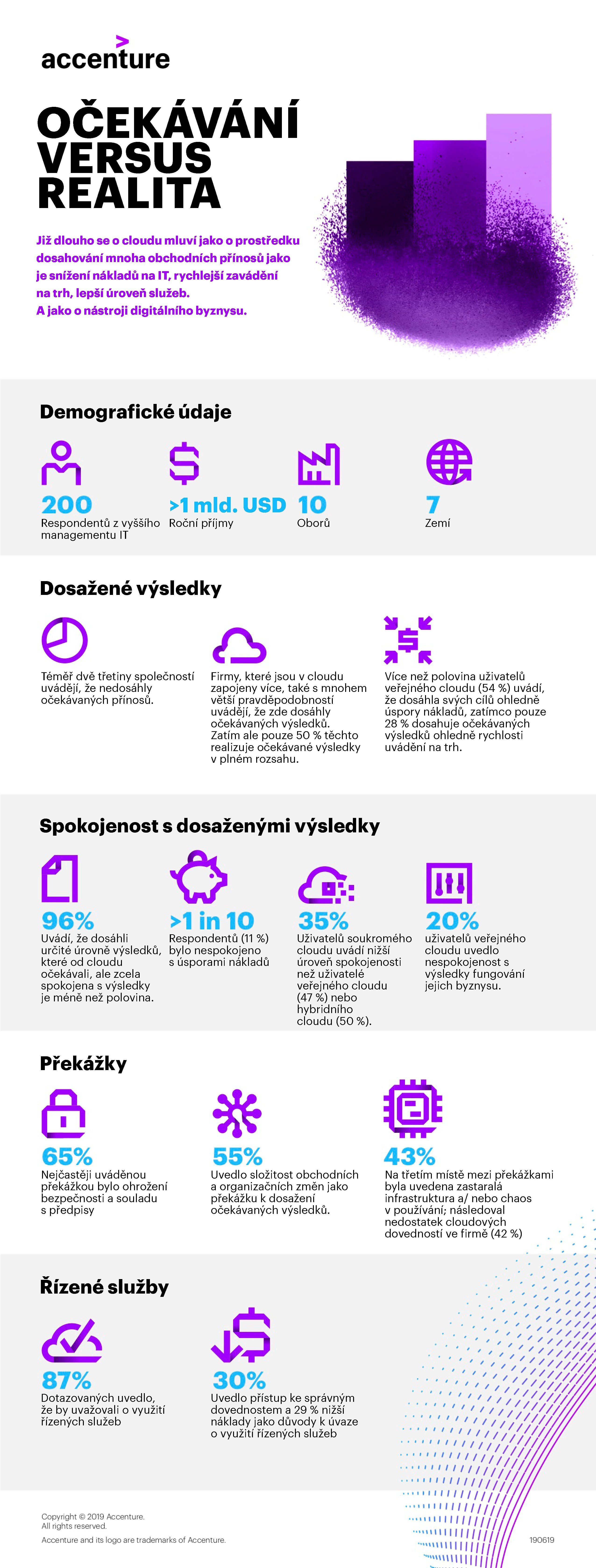 Nová zpráva společnosti Accenture „Přínosy cloudu: Očekávání versus realita” (Perspectives on Cloud Outcomes: Expectation vs. Reality) naznačuje, že je migrace do cloudu mnohem složitější, než se očekávalo, hlavně co se týče inovací a efektivity. Vyplývá to z průzkumu mezi 200 vysoce postavenými IT odborníky z velkých firem po celém světě. Překážkami jsou podle nich především ohrožení bezpečnosti a složitost obchodních i operačních změn.