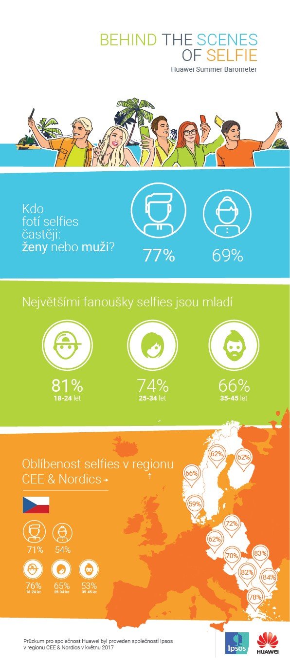 Ze studie Huawei Summer Barometer vyplývá, že směrem na sever Evropy obliba pořizování selfies obecně klesá. Nejvíce uživatelů pořizuje selfíes v Bulharsku, a to 84 % uživatelů, v Rumunsku 83 %, v Srbsku 82 % a 78 % v Řecku. Naopak nejméně populární jsou selfies v Dánsku (59 %), Švédsku, Finsku a v České republice, kde selfies fotí 62 % uživatelů.