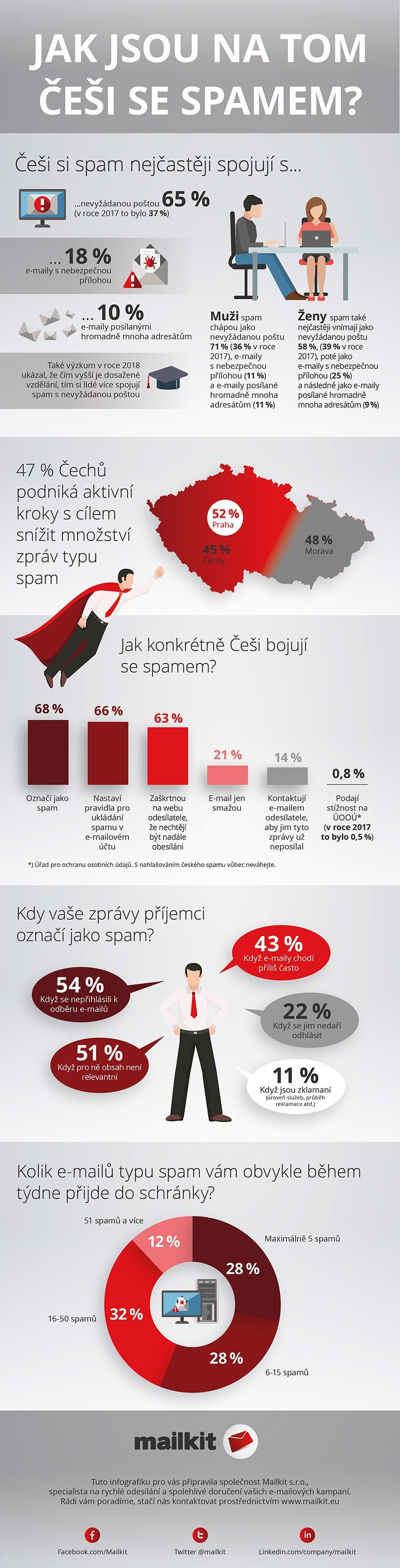 Stejně jako v roce 2017, také vloni se společnost Mailkit, která se specializuje na vytváření nástroje pro rozesílání a správu e-mailových kampaní, podívala na to, jak Češi vnímají zprávy typu spam. Výzkum pro Mailkit v obou letech provedla výzkumná agentura STEM/MARK.