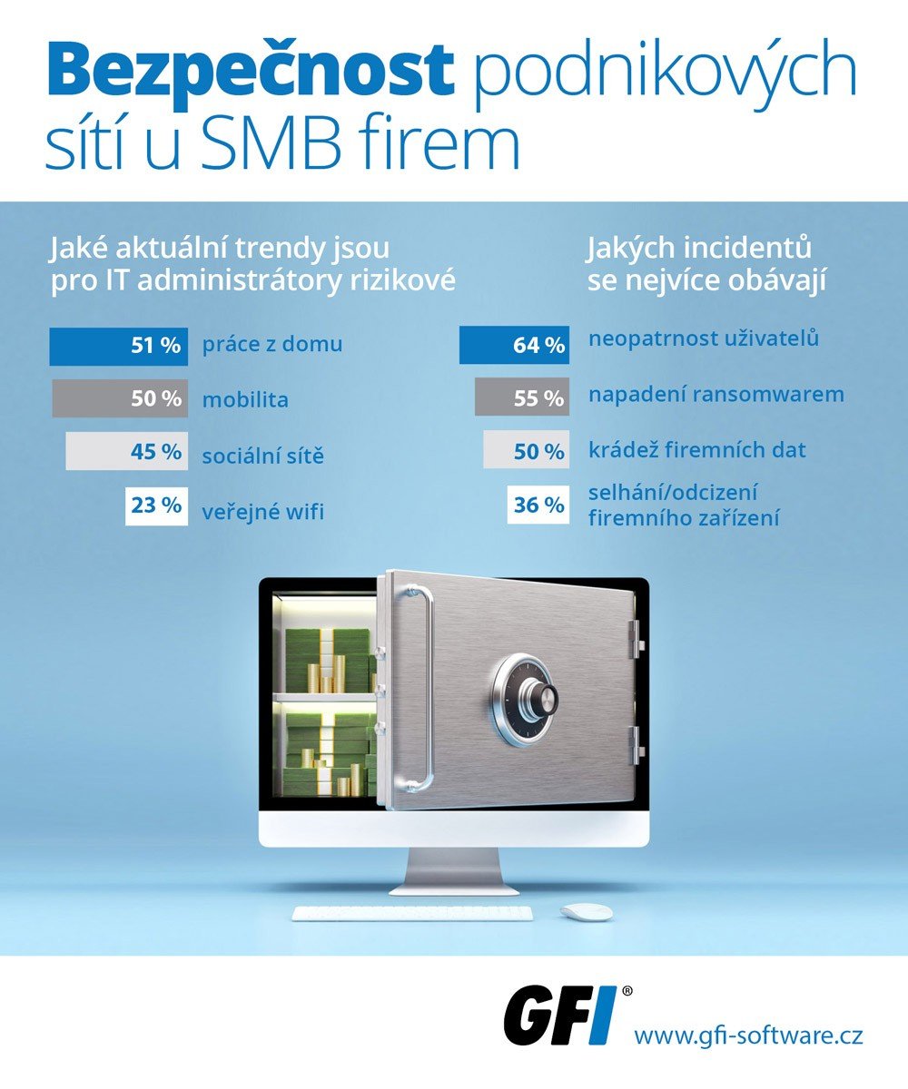 Společnost GBI zveřejnila výsledky svého lokálního průzkumu zaměřeného na problematiku bezpečnosti podnikových sítí, který provedla v červnu mezi českými zákazníky a prodejními partnery. Podle průzkumu patří mezi hlavní bezpečnostní incidenty neopatrnost vlastních uživatelů a ransomwary, kterých se obává 64 %, resp. 55 % malých a středně velkých společností (SMB).