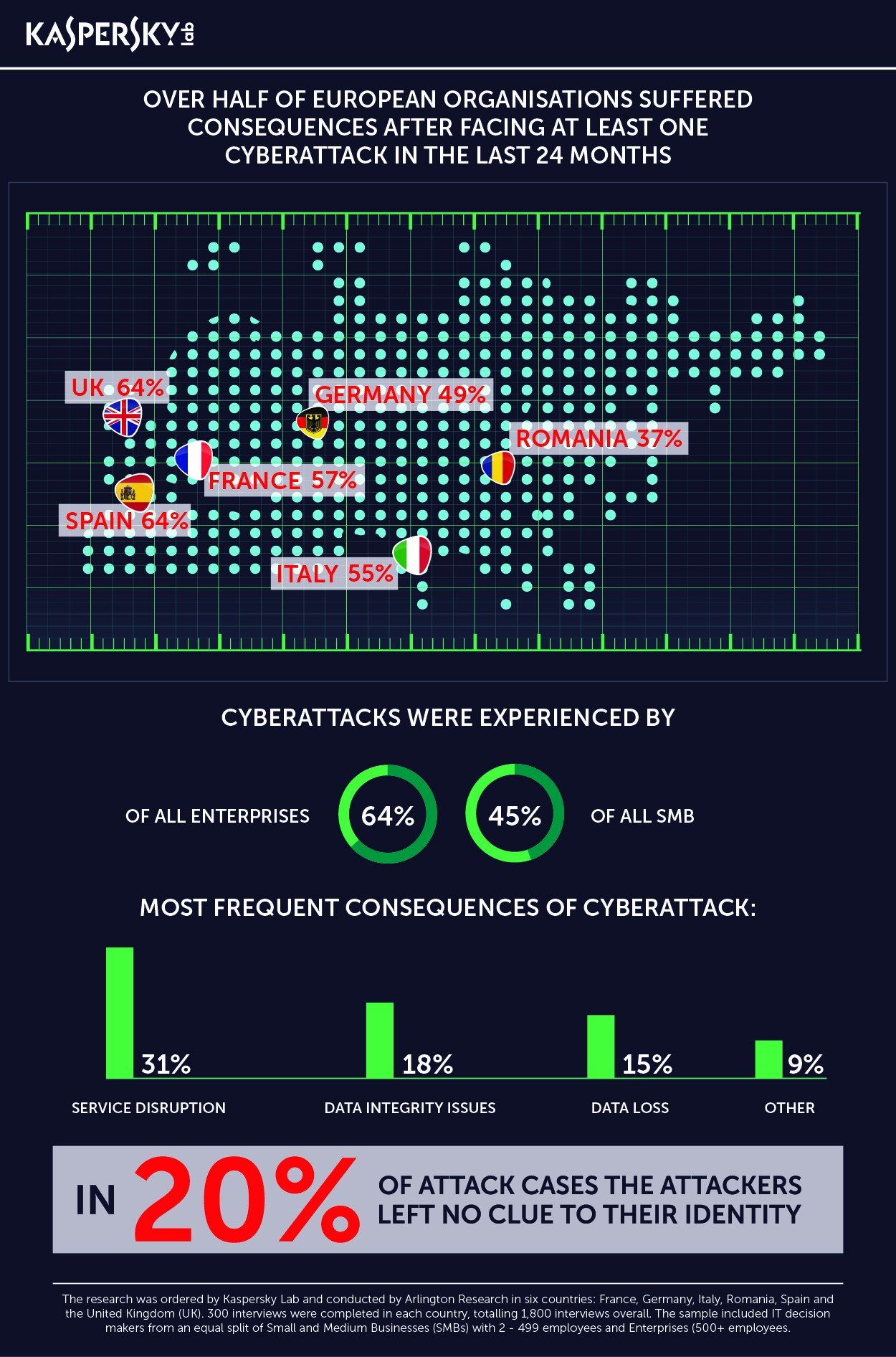 I když většinou mívají velké korporace na rozdíl od SMB firem vyhrazené vyšší rozpočty na správu svého IT, došlo u nich k více útokům (64 %), které měly výše zmíněné následky. S kyberútoky a následnými problémy se setkalo 45 % SMB firem. Největším rizikům pak čelily společnosti ve Velké Británii a Španělsku – kybernetické útoky zaznamenalo v obou státech shodně 64 % dotázaných.