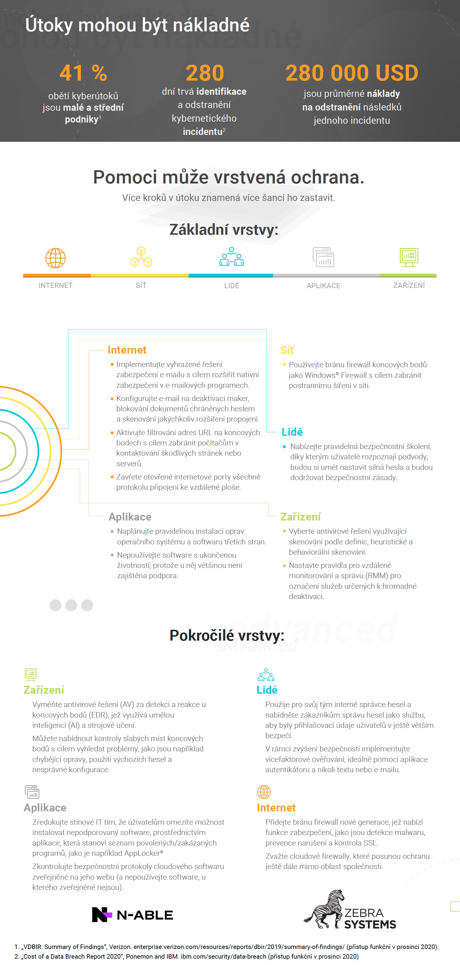 Společnost Zebra systems, distributor řešení N-able na českém a slovenském trhu, uvedl, že k efektivnímu zabezpečení zákaznických infrastruktur je třeba dnes chránit firemní IT prostředí na pěti úrovních: zařízení, aplikace, uživatelé, sítě a internet. MSP poskytovatelé, kteří dokáží na všech těchto úrovních vytvořit pokročilou vrstvenou ochranu, získávají v současnosti významný náskok před konkurencí.