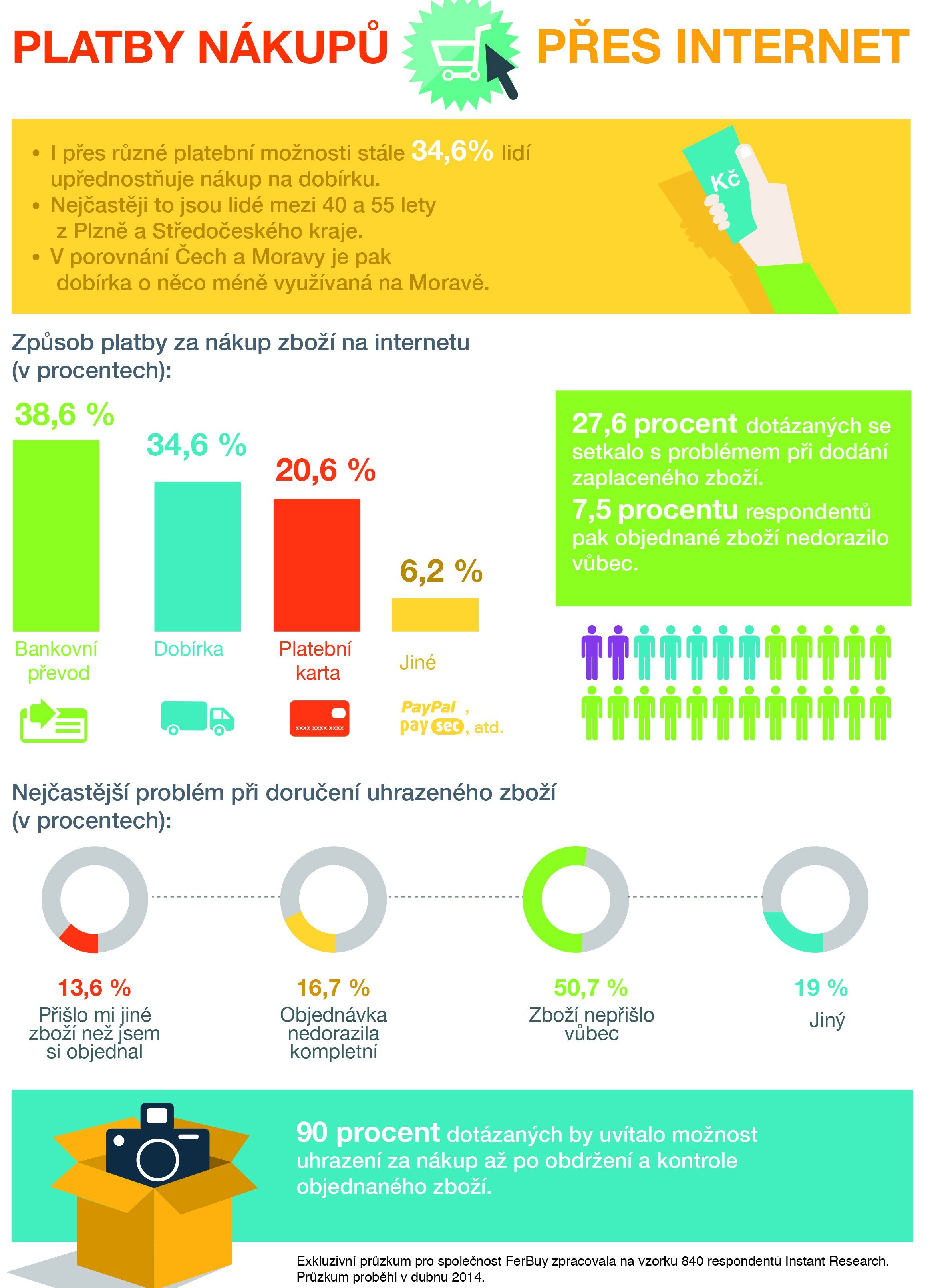 Ačkoli by 90 procent lidí upřednostnilo možnost zaplatit zboží až po jeho dodání a kontrole, alternativní platební metody využívá jen šest procent zákazníků. Třetina obyvatel nakupuje prostřednictvím internetu několikrát do měsíce. Nejčastěji přitom platí bankovním převodem. Podle průzkumu společnosti FerBuy jej využívá 38 procent dotázaných. V těsném závěsu následuje dobírka, která v České republice patří dlouhodobě mezi nejoblíbenější způsoby platby v e-shopech. Oproti tomu, platební kartu při nákupu přes internet používá jen pětina oslovených. Nejhůře jsou na tom alternativní platební metody jako PayPal či PaySec, které využívá pouze 6 procent respondentů.