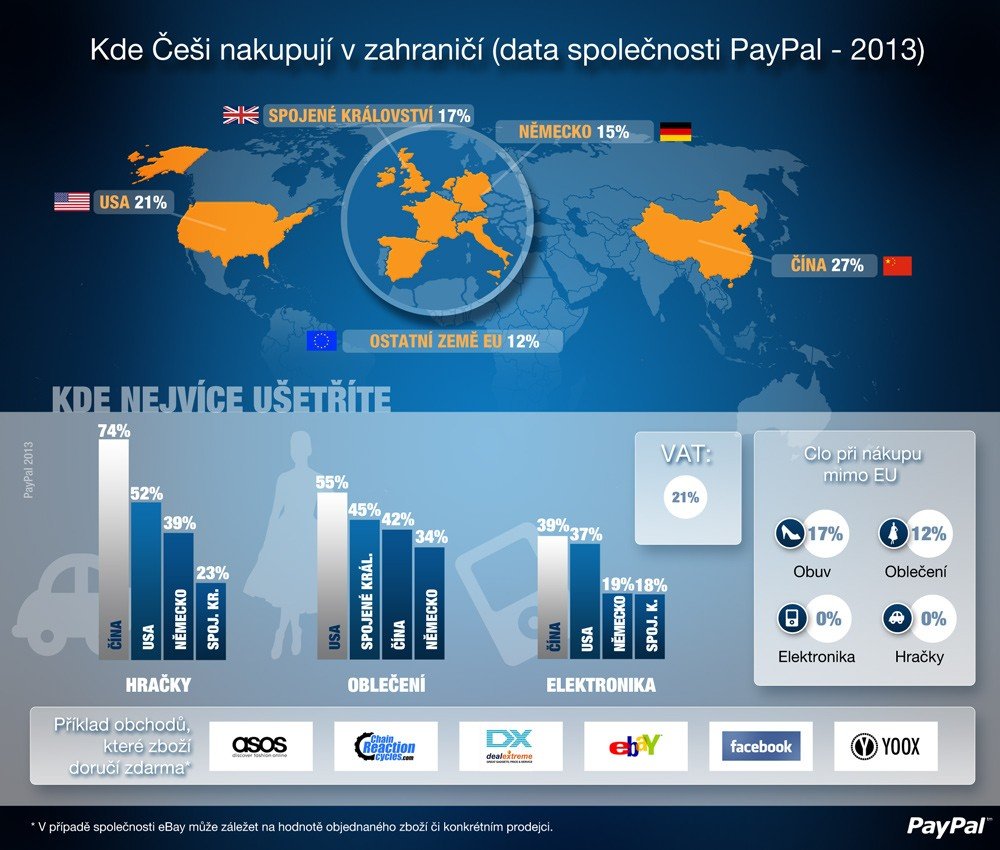 Z údajů společnosti PayPal vyplývá, že platby českých uživatelů prostřednictvím systému PayPal v letech 2012 – 2013 směřovaly především k prodejcům ve Velké Británii, Číně, Německu a USA. Největší nárůst průzkum zaznamenal u plateb čínským obchodům (v porovnání s předchozím rokem až o 30 %). Platby v německých obchodech narostly o 15 %, v britských o 18 %.