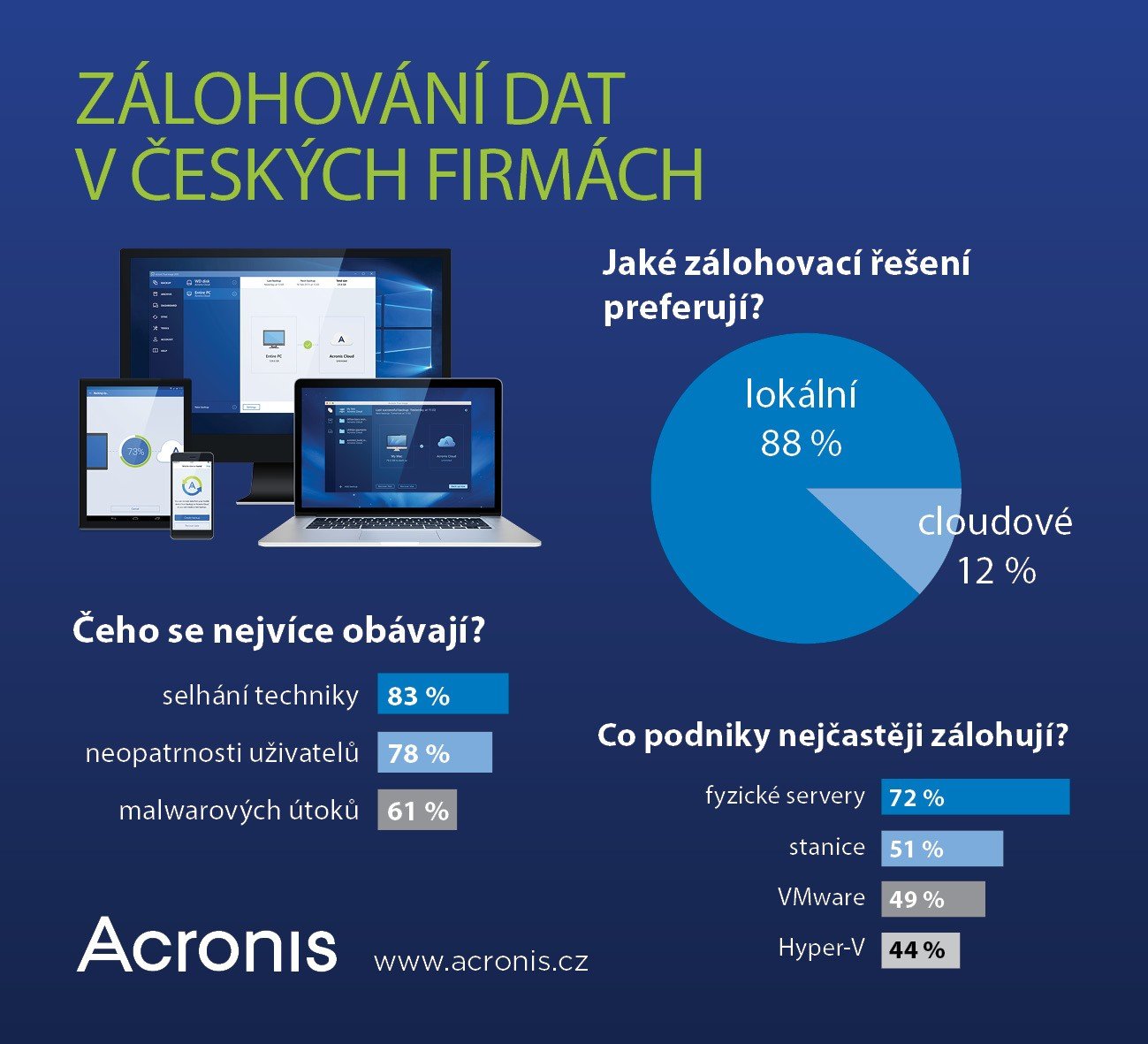 Z lokálního průzkumu společnosti Acronis vyplývá, že v souvislosti se ztrátou důležitých dat se 83 % českých společností a organizací nejvíce obává selhání techniky. Nejčastěji potřebují zálohovat fyzické servery, ale rychle narůstá podíl zálohování virtualizované infrastruktury.