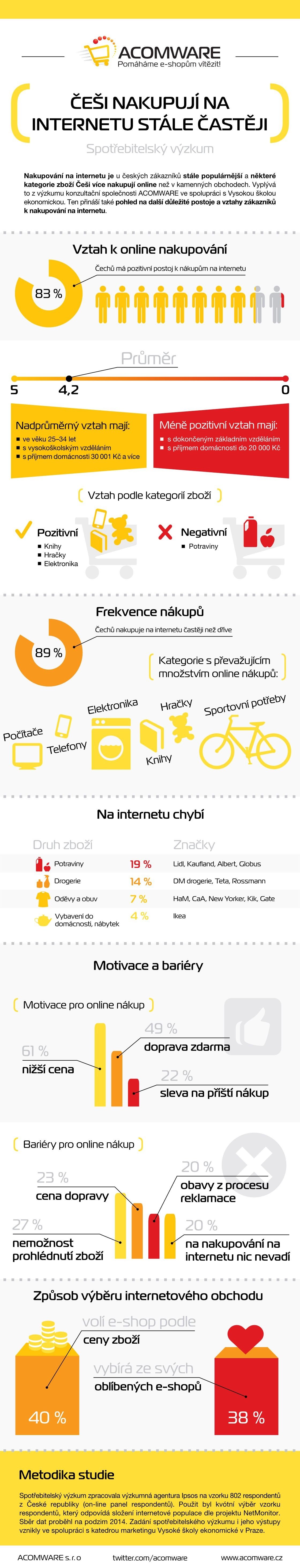 Cílem spotřebitelského výzkumu, který byl uskutečněn na vzorku 802 respondentů, bylo zjistit aktuální vztah a postoje českých zákazníků k nákupům na internetu. „Češi mají obecně velmi pozitivní přístup k internetovému nakupování. Nejpopulárnější jsou knihy, hračky nebo elektronika, naopak poměrně negativní je vztah k nákupu potravin nebo stavebnin,“ vysvětlil Jan Penkala, CEO konzultační společnosti Acomware.