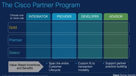 Nový partnerský program společnosti Cisco je založený na čtyřech základních rolích, v nichž mohou partneři vystupovat: integrátor, poskytovatel služeb, vývojář a konzultant. Partneři se mohou rozhodnout pro kteroukoli z rolí nebo všechny – přesně jak vyhovuje jejich obchodnímu zaměření. Základem nového programu je varianta Gold. U úrovní Premier a Select dochází k úpravám, které zajistí, že partneři budou mít potřebnou volnost ke vzájemnému odlišení svých nabídek. Stávající partneři nebudou muset začínat znovu v novém programu, protože ten je koncipovaný tak, aby odrážel jejich rozsáhlé zkušenosti a dlouhodobé partnerství se společností Cisco.