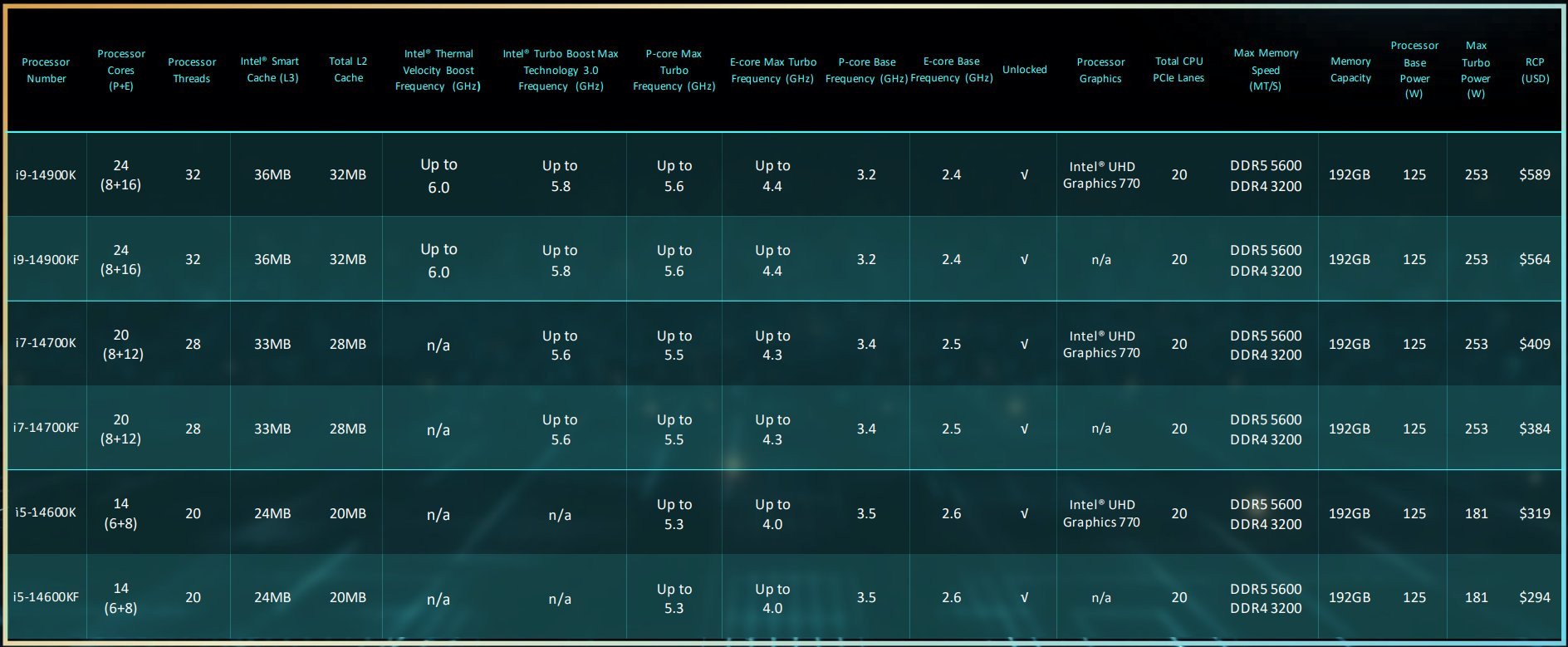 Čtrnáctá generace Intel Core bude v první vlně začínat se šesti procesory, z nichž nejvýkonnější je Intel Core i9-14900K se 24 jádry a 32 vlákny, podle výrobce nejrychlejší současné desktopové CPU na světě. Tento čip je schopen při zapojení technologie Intel Thermal Velocity Boost krátkodobě dosáhnout taktovací frekvence až 6 GHz. Další nové modely by měly následovat v příštím roce. Za zmínku stojí také vylepšení řady Intel Core i7-14700K, která díky mezigeneračnímu rozšíření o čtyři efektivní (E-cores) jádra nabídne celkových 20 jader (a 28 vláken).
